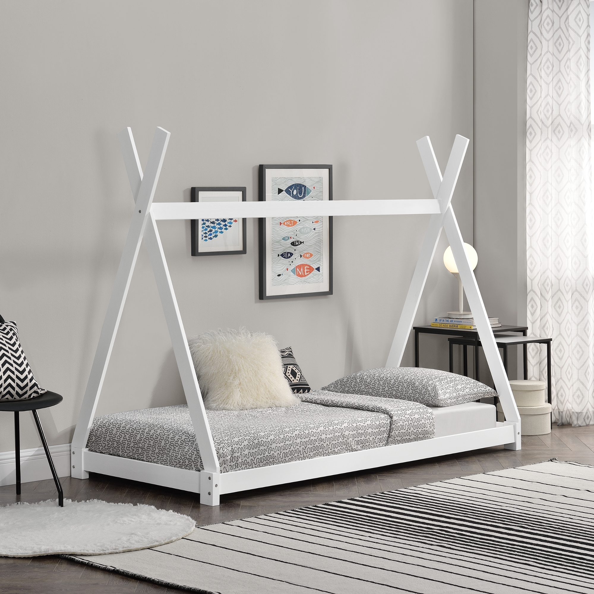 Aus robustem Kiefernholz verschönert das stabile Tipibett von en.casa durch seine Optik jedes Kinderzimmer und schenkt Ihrem Liebling einen angenehmen Schlafplatz. Das Bettchen bietet eine geräumige Liegefläche in 90x200 cm und ist mit einem robusten Lattenrost ausgestattet. **Produktdetails:** \\- Kinderbett in Tipi-Optik \\- Stabile Bauweise \\- Leichte Montage. **Maße:** \\- Gesamt (L x B x H): 208 x 96 x 163 cm \\- Bettpfosten (H x B x T): 157 x 8 x 2 cm \\- Matratzenmaß (L x B): 200x90 cm \\- Seitenteil Höhe: 9 cm \\- Abstand vom Boden zum Seitenteil: 4 cm. **Material:** Kiefernholz. **Farbe:** Weiß, matt lackiert.