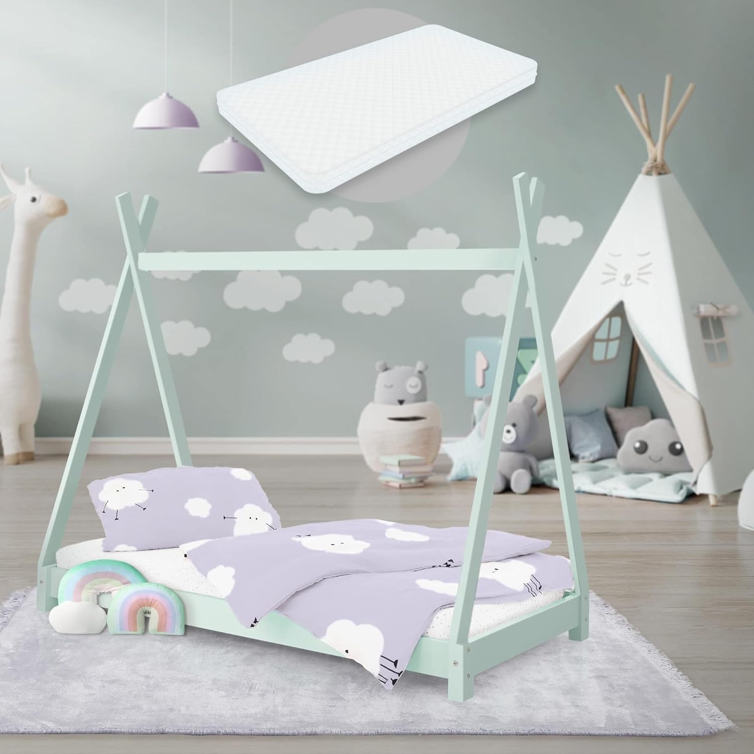 in Tipi BettenML-DESIGN Kinderbett Hausbett Tipi Zeltbett inkl. Lattenrost Bodenbett Kinder HimmelbettAbenteuerbett zum Spielen Zelt Spielbett Kiefer Bettenhaus Bett Mint