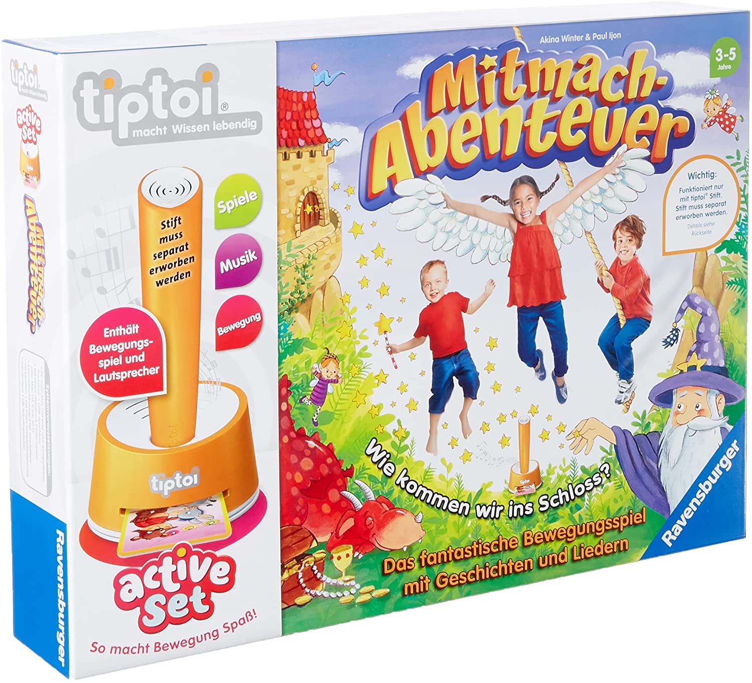 Was ist tiptoi? tiptoi ist ein innovatives Lern- und Kreativsystem, mit dem Kinder die Welt spielerisch entdecken. Das tiptoi® Sortiment umfasst Bücher, Spiele und Spielzeug mit den wichtigsten Lern- und Wissensthemen für Kinder ab 3 Jahren. Tippt man mit dem Stift auf ein Bild oder einen Text, erklingen passende Geräusche, Sprache oder Musik. Die kostenlosen Audiodateien lädt man sich einfach, sicher und schnell über den tiptoi® Manager auf den Stift. Für 1-6 Spieler. Spieldauer: 20 Min. Benötigt 3 x AAA LR03 Batterien. Benötigt tiptoi-Stift (nicht enthalten). Stift muss separat erworben werden! Ein zauberhaft interaktives Bewegungsspiel - Trainiert spielerisch Körpergefühl und Gleichgewicht - Tolle Musik und lustige Reime motivieren zur Bewegung. Mit dem active Set Mitmach-Abenteuer kommt Bewegung ins Spiel! Die Spieler schwingen ihre Zauberstäbe, flattern mit magischen Flügeln durch die Luft oder klettern an einem Seil nach oben. Denn nur, wenn sie die verschiedenen Bewegungsaufgaben meistern, können die Spieler dem Zauberer, den Elfen und den sprechenden Tieren helfen. Tolle Musik und lustige Reime sorgen für jede Menge Spaß an der Bewegung. Achtung. Nicht für Kinder unter 36 Monaten geeignet. Erstickungsgefahr wegen verschluckbarer Kleinteile. Altersempfehlung:von 3 bis 5