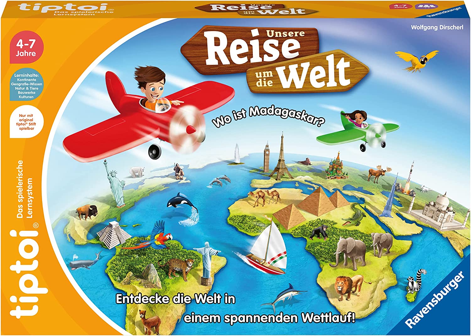 | Beschreibung | Rund um die Welt in einem spannenden Wettlauf! Die Spieler begeben sich auf eine atemberaubende Reise rund um die Erde. Schaffen sie es die schönsten Orte zu erreichen, bevor ein Segelschiff die Welt umrundet? In diesem Lernspiel ab 4 Jahren, erfahren die Kinder spannendes Wissen über die Kontinente, Natur und Tiere, sowie über Kulturen und Bauwerke. Wo leben Löwen? Und wo steht Big Ben? Auf der Welt gibt es Einiges zu entdecken! |