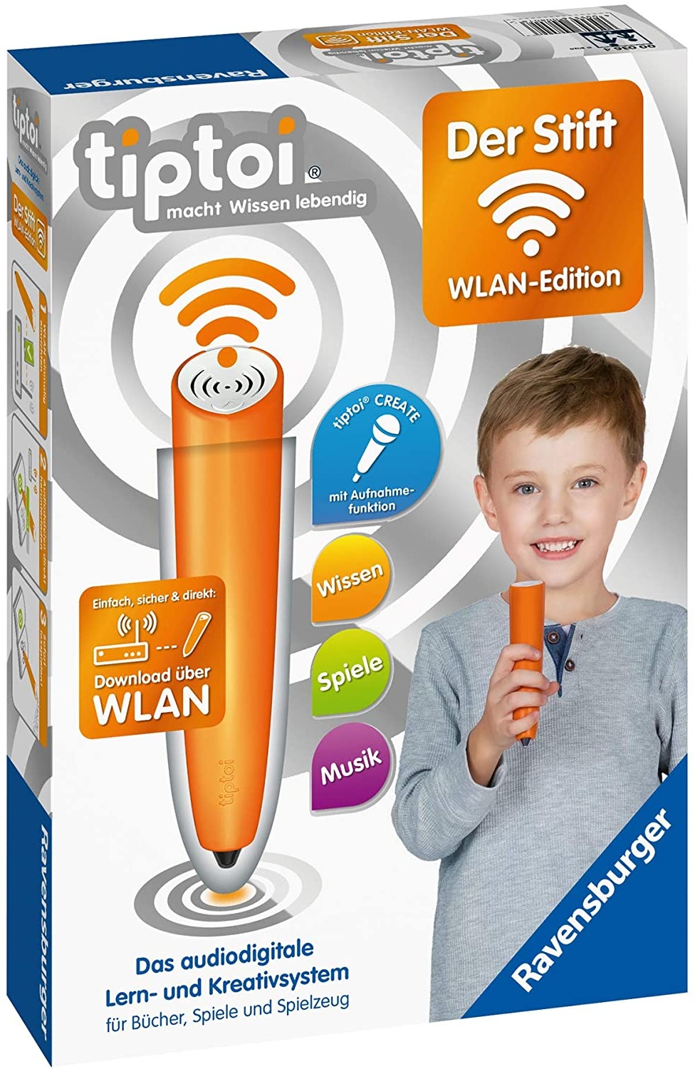 tiptoi® ist das beliebte audiodigitale Lern- und Kreativsystem von Ravensburger Der tiptoi® Stift macht Wissen lebendig. Er funktioniert mit allen Produkten, die das tiptoi® Logo tragen: mit Büchern, Spielen und Spielzeug. Die Aufnahmefunktion des Stiftes können Kinder in Büchern, Spielen und Stickern der Reihe tiptoi® CREATE nutzen: Geräusche erfinden, Geschichten erzählen, Lieder singen – fantasievoll und interaktiv die eigene kreative tiptoi® Welt gestalten! Die WLAN-Edition ist eine Spezialausgabe des tiptoi® Stiftes mit Aufnahmefunktion. Nach einmaliger Einrichtung der Verbindung zu Ihrem vorhandenen WLAN-Heimnetz kann der Stift die Audiodateien für neue tiptoi® Produkte automatisch aus dem Internet herzunterladen. Nach dem Herunterladen wird die WLAN-Verbindung automatisch getrennt. Der eingebaute Akku wird über das mitgelieferte Kabel aufgeladen. Packungsinhalt: tiptoi® Stift mit Aufnahmefunktion und WLAN, Verbindungskabel, Sticker zum Testen der Aufnahmefunktion, Bedienungsanleitung. (Ein USB-Netzteil ist nicht enthalten) Maße: 19 x 28 x 6 cm Altersempfehlung: ab 3 Jahre Achtung! Nicht für Kinder unter 36 Monaten geeignet. Erstickungsgefahr wegen verschluckbarer Kleinteile.