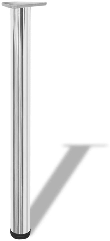 | Beschreibung | Dieses Set umfasst 4 höhenverstellbare Tischbeine aus robustem Eisen in Chromfarbe. Mit einem Durchmesser von 60 mm und einer Höhe von 710 mm sind diese Beine ideal als Ersatz für Theken, Tische, Arbeitsflächen oder Schreibtische geeignet. Die verstellbaren Schraubfüße ermöglichen eine Anpassung der Höhe von 710 mm bis 720 mm, um Bodenunebenheiten auszugleichen. Die Montage gestaltet sich einfach und schnell. **Highlights** - Verstellbare Schraubfüße ermöglichen eine Höhenverstellung von 710 mm bis 720 mm - Kann als Thekenbeine, Tischbeine, Arbeitsplattenbeine oder Schreibtischbeine verwendet werden - Sehr robust und stabil - Einfache und schnelle Montage **Produkteigenschaften** - Farbe: Chrom - Rohrmaterial: Eisen - Abmessungen: 60 x 710 mm (Durchmesser x Höhe) **Lieferumfang** - 4 x Rohr - 4 x Fuß - 4 x Montageplatte - 4 x Schraube |