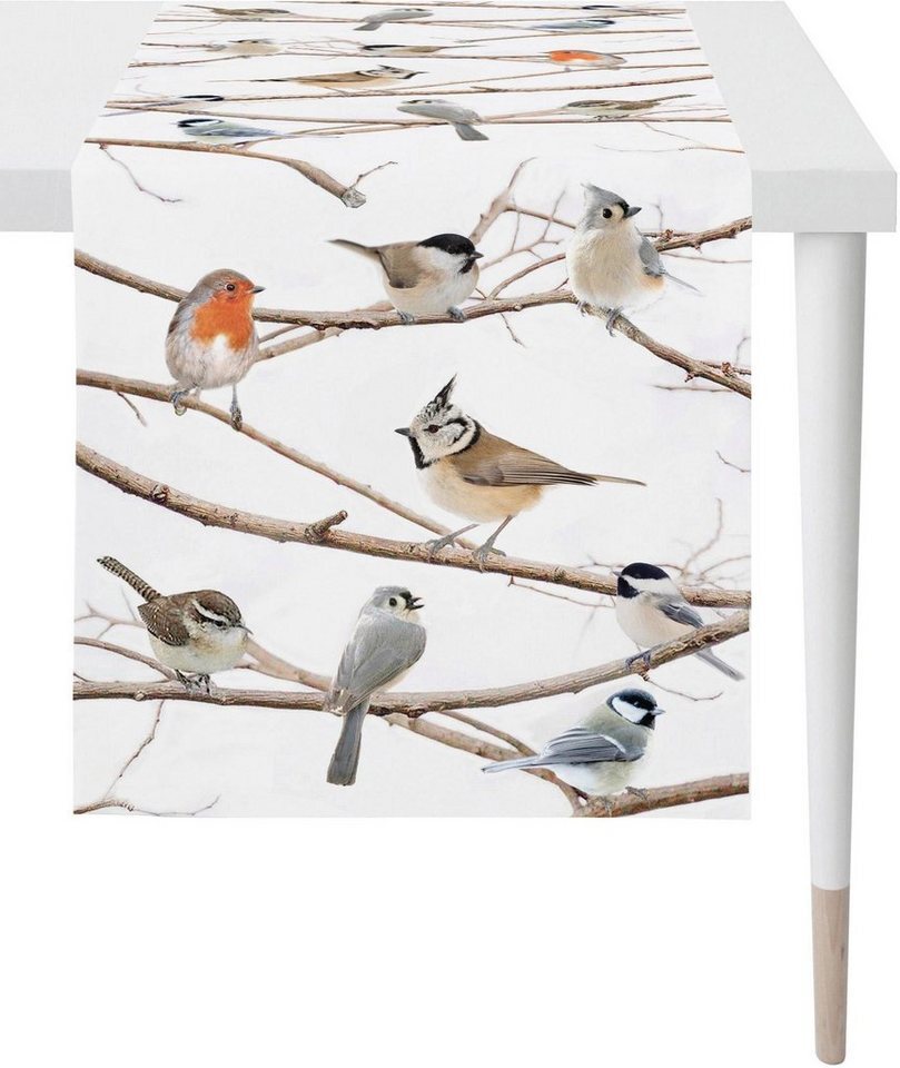 Beschreibung Der APELT Tischläufer „1414 Winterwelt“ ist die perfekte Weihnachtsdeko für festliche Anlässe. Mit einem niedlichen Vogel-Motiv und hochwertiger Verarbeitung bringt er winterliche Stimmung auf Ihren Tisch. Der Tischläufer ist aus 100 % Baumwolle gefertigt und überzeugt durch seinen feinen Digitaldruck. Er ist waschbar bei 30 °C im Schonwaschgang und sollte feucht aufgehängt werden. **Highlights** - Niedliches Vogel-Motiv für eine festliche Atmosphäre - Hochwertige Verarbeitung mit aufwändig genähter Briefecke - Feiner Digitaldruck für lebendige Farben - Waschbar bei 30 °C im Schonwaschgang - Ideal für die weihnachtliche Tischdekoration **Produkteigenschaften** - Material: 100 % Baumwolle - Maße: ca. 46 x 135 cm **Lieferumfang** - 1 x Tischläufer „1414 Winterwelt“ - Exklusive Tischdeko und Geschirr