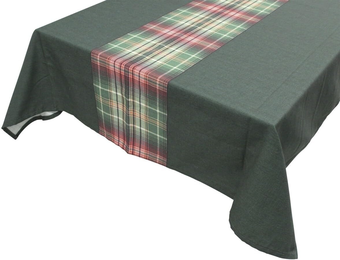 **Tafeldecke "Karogrün" Elegante Tischwäsche Dunkelgrüner Grundstoff mit trendigem Mittelstreifen im Schottenlook Material: 70% Polyester, 30% Baumwolle Nur Handwäsche, bügeln auf Stufe 1 Maße ca.: 140 x 240 cm Lieferung ohne Deko**