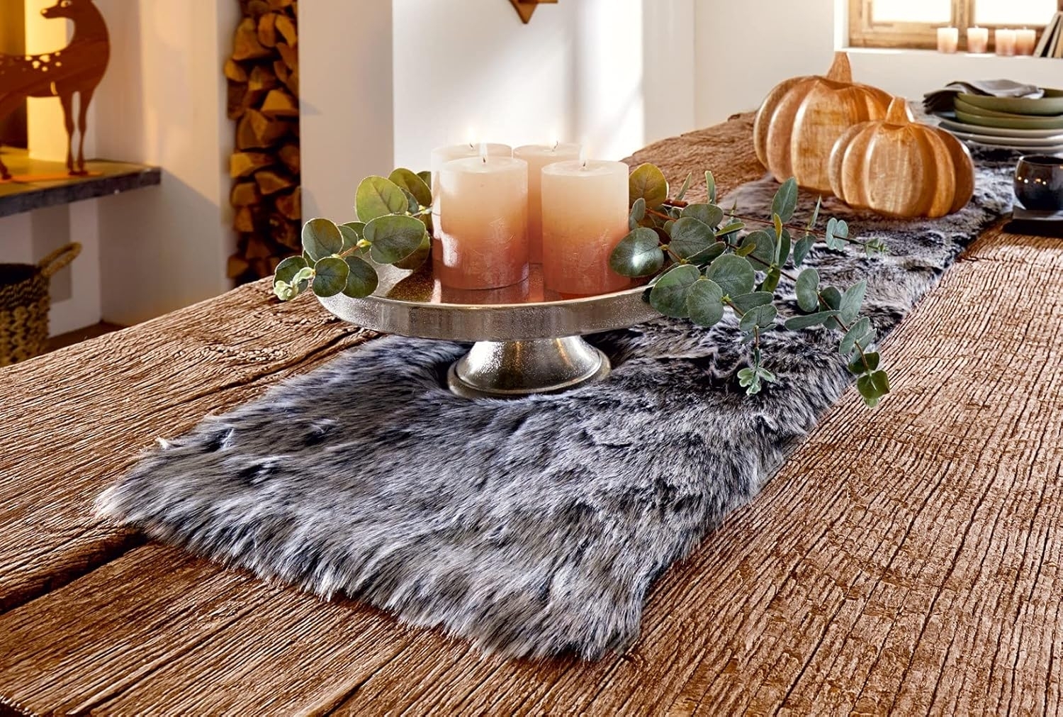 **Tischläufer "Felloptik" Flauschiges Kunstfell in angesagtem Schwarz/Grau Rückseite Microfaser in Veloursoptik 100% Polyacryl Maße ca.: 33 x 140 cm Lieferung ohne Deko**