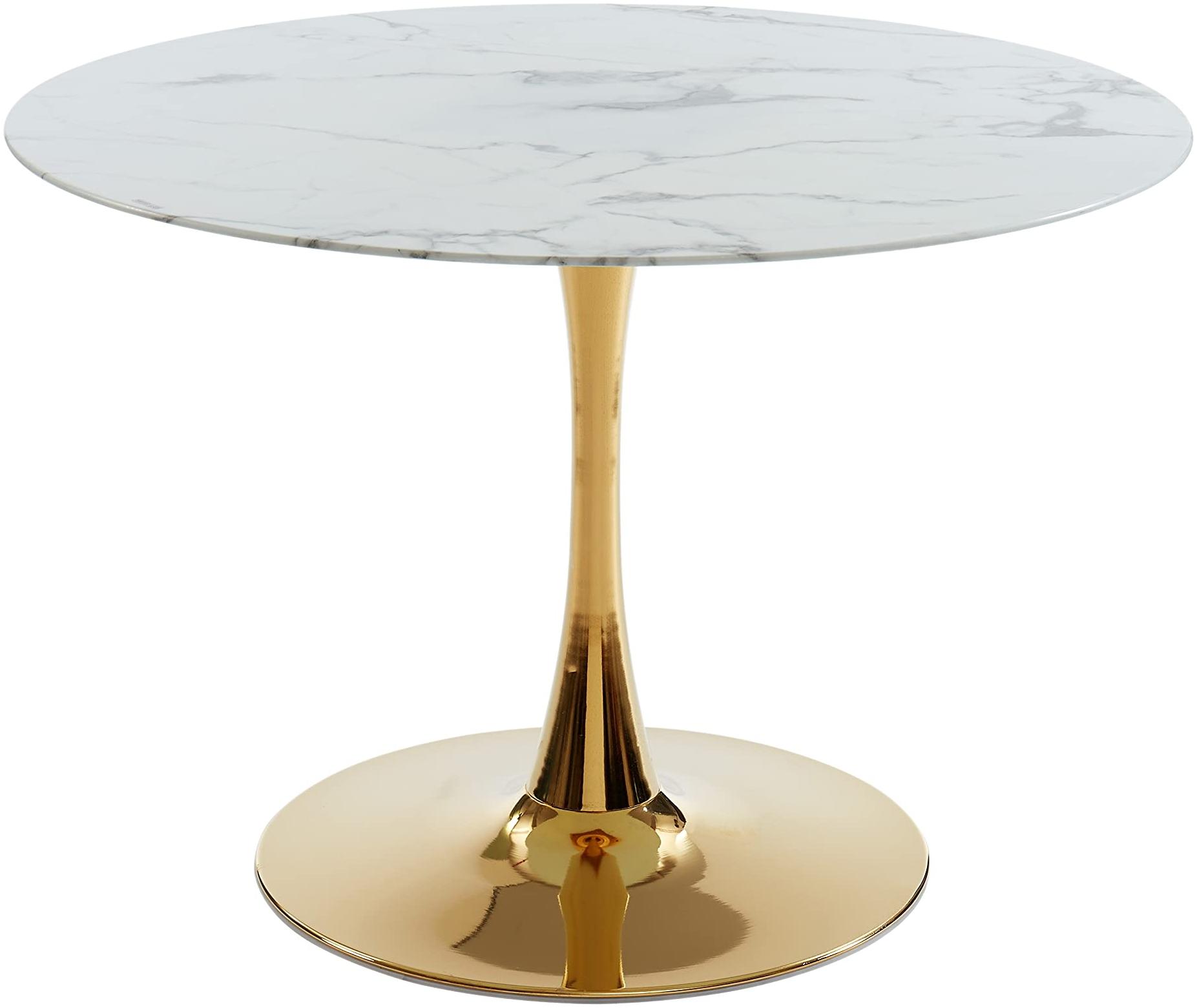Moderner Wohnzimmertisch MONIKA Eine runde Platte aus gehärtetem Glas in Marmoroptik Ein Fuß aus vergoldetem Metall Maße (L x T x H): 110 x 110 x 74 cm