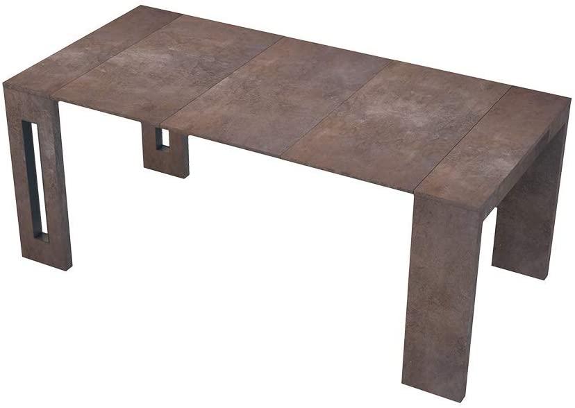 Der Selsey Roma Ausziehtisch vereint modernes Design mit Funktionalität. Mit einer kompakten Tiefe von nur 45 cm im nicht ausgezogenen Zustand eignet er sich ideal für kleine Räume. Nach dem Ausziehen bietet der Tisch Platz für bis zu 10 Personen und beeindruckt mit einer großzügigen Fläche von 120 x 186 cm. Die strukturierte Oberfläche in ansprechender Kupferoptik setzt stilvolle Akzente in Ihrem Essbereich. **Highlights** - Ausziehbar für bis zu 10 Personen - Platzsparend mit nur 45 cm Tiefe im nicht ausgezogenen Zustand - Strukturierte Oberfläche in angesagter Kupferoptik - Leichtgängiger Tischauszug mit 3 Einlegeplatten - Schlitze in den Tischbeinen für praktische Lagerung der Einlegeplatten **Produkteigenschaften** - Abmessungen: 186 x 120 x 76 cm - Länge verstellbar: 45/92/139/186 cm - Material: MDF - Farbe: Braun **Lieferumfang** - 1x Ausziehtisch Selsey Roma - 3x Einlegeplatten - Ohne Dekoration