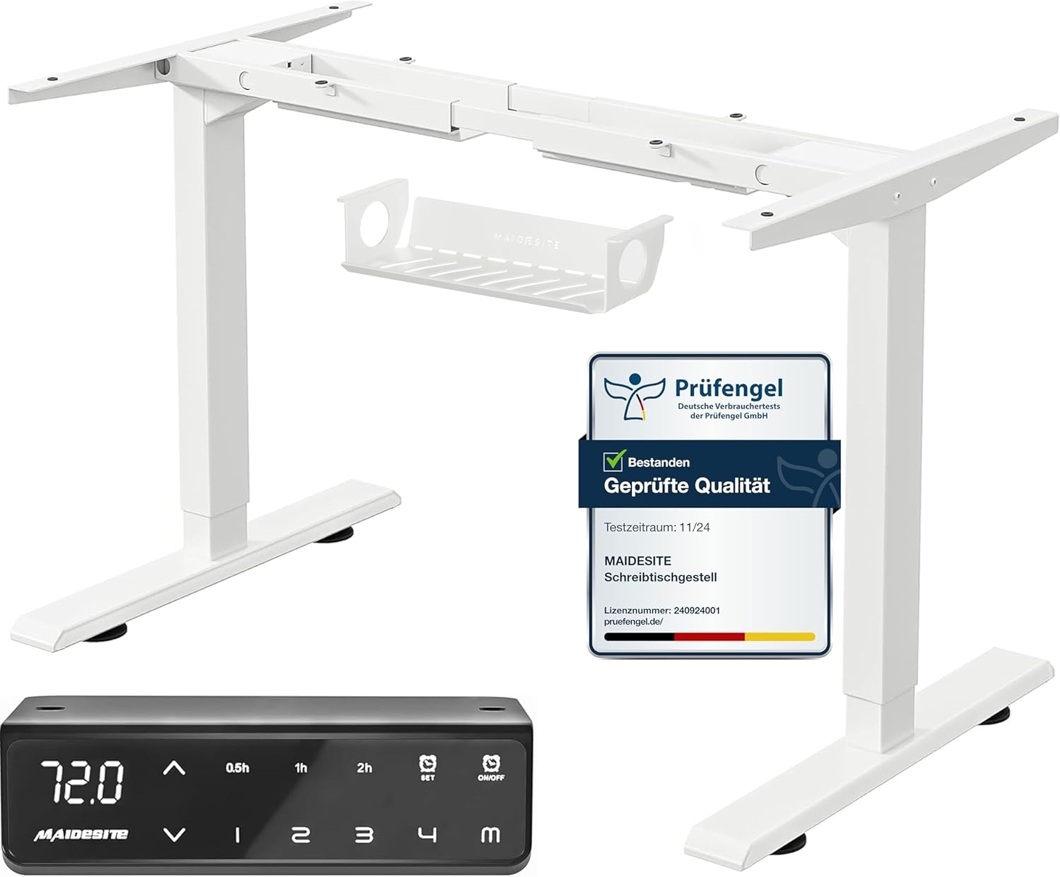 Der MAIDeSITe höhenverstellbare elektrische Schreibtisch bietet Ihnen eine innovative Lösung für ergonomisches Arbeiten. Mit 2 starken Motoren und einem stabilen Tischgestell aus pulverbeschichtetem Stahl ermöglicht er eine Höhenverstellung von 72 bis 120 cm und eine erweiterbare Rahmenbreite von 108 bis 180 cm. Der LED-Controller mit Memory-Funktion speichert bis zu 4 individuelle Höhen. TÜV-zertifiziert und mit einer Tragfähigkeit von 102 kg ist er ideal für langfristig sitzende Tätigkeiten. **Highlights** - Höhenverstellbar von 72 - 120 cm - Rahmenbreite erweiterbar von 108 - 180 cm - Dualer Silent-Motor für sanfte Höhenverstellungen - Gestell aus pulverbeschichtetem Stahl mit einer Tragfähigkeit von 102 kg - LED-Controller mit Memory-Funktion für individuelle Höheneinstellungen **Produkteigenschaften** - 2 starke Motoren für maximale Stabilität - Hubgeschwindigkeit von 32 mm/sek - Geräuschpegel unter 45 dB für eine geräuscharme Benutzung - Erfüllt deutsche Sicherheitsstandards und ist TÜV-zertifiziert - 5 Jahre Gewährleistung für Tischgestell und 3 Jahre Gewährleistung für Motor **Lieferumfang** - 1x höhenverstellbares Tischgestell (ohne Tischplatte)