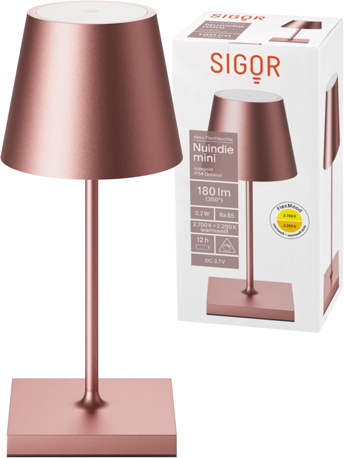 - Die Nuindie mini Akku-Tischleuchte hat ein elegantes, pulverbeschichtetes Aluminiumgehäuse, das sowohl für Innen- als auch Außenbereiche geeignet ist.