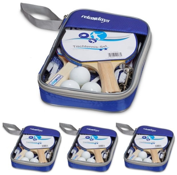 Das Relaxdays '2 Sterne' Tischtennis-Set ist ideal für Hobbyspieler und verwandelt jeden Tisch in eine Tischtennisplatte. Es enthält 8 Schläger, 12 Bälle und 4 Netze mit Haltevorrichtung, alles handlich in einer praktischen Tragetasche verpackt. Die Schläger aus Holz sind mit einem rot-schwarzen Schaumgummi-Überzug versehen. Perfekt für unterwegs und zum Üben. **Highlights** - Mobiles Tischtennis Set für Anfänger - Handliche Kellen aus Holz mit zweifarbigem Gummibezug - Mit 2-Sterne Trainingsbällen zum Üben - Netze für Tische und Tischtennisplatten im Freien - Praktisches Geschenk für Hobbyspieler **Produkteigenschaften** - Set aus 8 Schlägern, 12 Bällen, 4 Netzen - Tasche H x B x T: ca. 27 x 18 x 4 cm - Gewicht: je ca. 0,5 kg - Größe Schläger H x B x T: ca. 25,7 x 15 x 2 cm - Schlagfläche H x B x T: ca. 15,5 x 15,2 x 1 cm - Durchmesser Ball: ca. 4,0 cm - Größe Netz H x B x T: ca. 14 x 150 x 1,7 cm - Max. Stärke Tischplatte: ca. 5 cm **Lieferumfang** - 4x blaue Transporttasche - 4x Tischtennisnetz mit Halterung - 8x Tischtennisschläger - 12x Tischtennisball - Dekorationsartikel sind nicht im Lieferumfang enthalten
