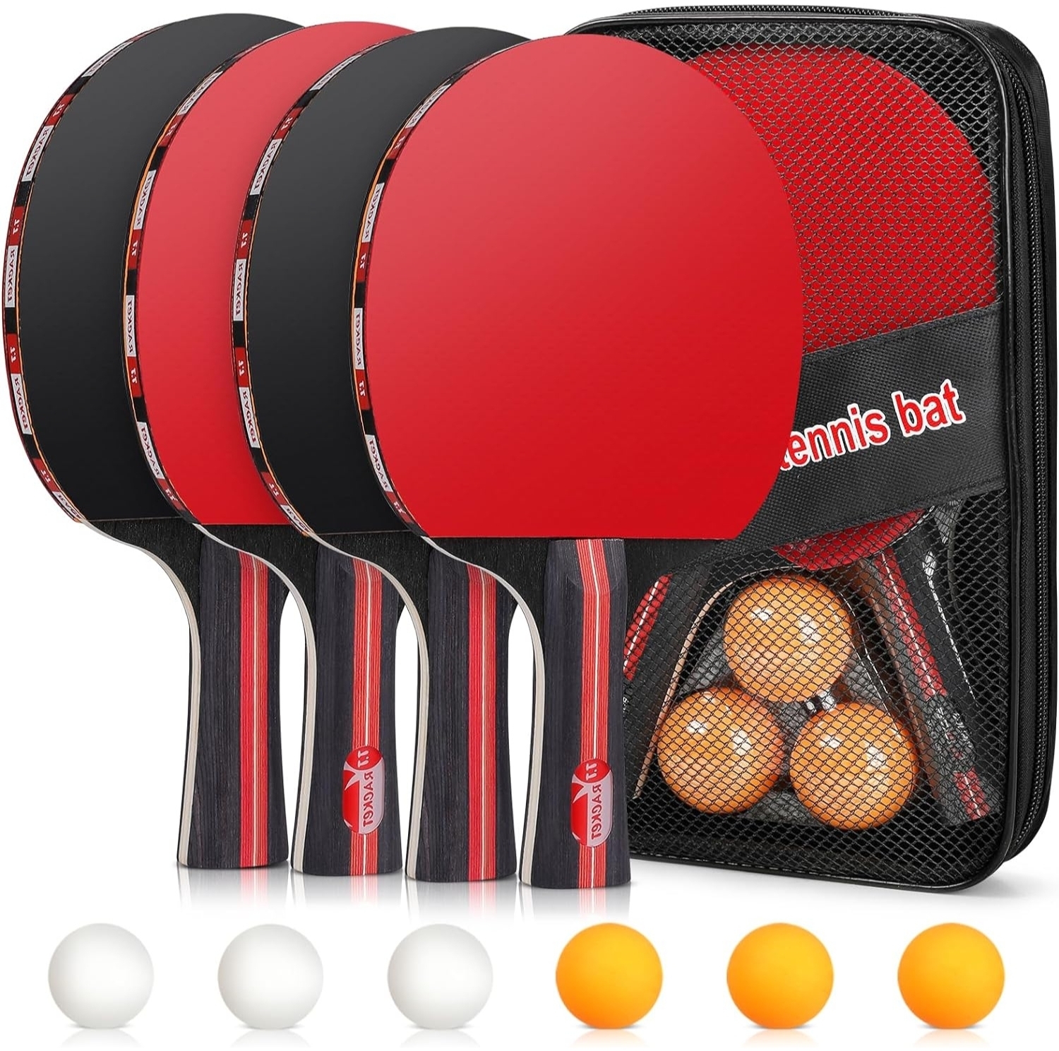 - **Tischtennisschläger Set** - Mit diesem Tischtennis Set erhalten Sie 4 hochwertige Tischtennisschläger für Indoor & Outdoor Spiele. - **tischtennisbälle** - Enthält 6 orangefarbene oder weiße Tischtennisbälle aus hochwertigem ABS-Kunststoff für flexible Rotation und Geschwindigkeit. - **Gummigriff** - Die Tencoz Tischtennisschläger sind mit einem langlebigen Gummi ausgestattet, der Ihnen ein besseres Gefühl von Kraft und Komfort bietet. - **Hohe Elastizität** - Die Oberfläche der Schläger ist mit einem 2 mm hohen elastischen Schwamm und doppelseitigem Gummi umwickelt, für eine hervorragende Kontrolle beim Spiel. - **Tischtennis Set** - Das Paket beinhaltet 4 Tischtennisschläger, 6 Tischtennisbälle und 1 Tragetasche, ideal für Spiele zu Hause, im Garten oder auf Reisen. Dieses Tischtennis Set von Tencoz bietet alles, was Sie für spannende Tischtennisspiele benötigen. Die 4 Tischtennisschläger verfügen über einen Gummigriff, der eine starke Struktur und einen komfortablen Griff bietet. Mit hochelastischem Schwamm und qualitativem Gummi gewährleisten die Schläger eine optimale Kontrolle für Offensiv- und Defensivspiel. Die 6 Tischtennisbälle sind aus hochwertigem ABS-Kunststoff gefertigt und sorgen für flexible Rotation und Geschwindigkeit während des Spiels. Zusätzlich enthält das Set eine praktische Tragetasche, so dass Sie Ihr Tischtennis Equipment überallhin mitnehmen können. Ob drinnen oder draußen, dieses Tischtennis Set ist ein Muss für alle Tischtennisliebhaber. Es eignet sich perfekt für Familien, Anfänger, Profis oder einfach zum Spaß mit Freunden. Überraschen Sie Ihre Liebsten mit diesem Tischtennis Set als Weihnachts- oder Geburtstagsgeschenk und genießen Sie gemeinsame Stunden voller Spielspaß und Bewegung.