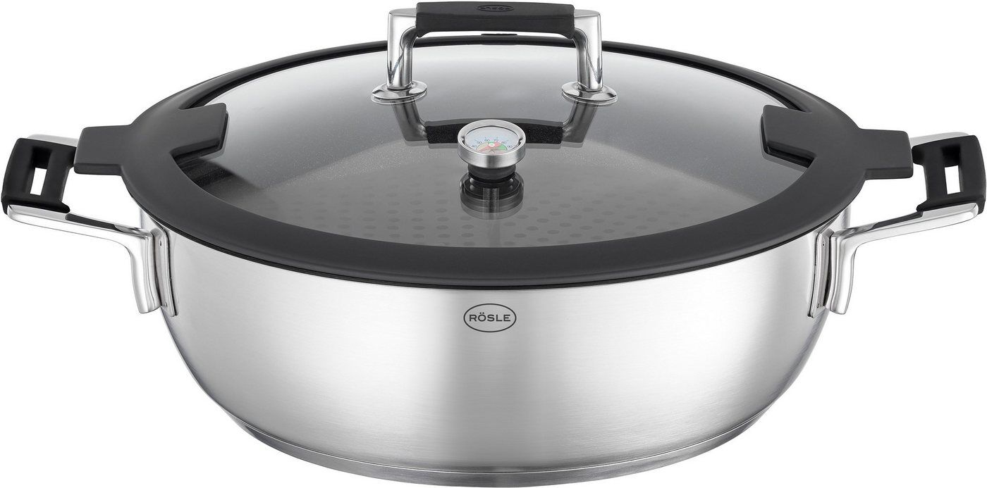 Der RÖSLE SILENCE PRO Aroma Dampfgarer ist ein hochwertiger Schmortopf, der sich ideal zum Dämpfen, Warmhalten und Aufwärmen von Fleisch, Fisch, Geflügel und Gemüse eignet. Mit diesem Dampfgarer gelingen Klöße locker, Geflügel bleibt saftig und Gemüse wird unvergleichlich zart. Das schonende Garen und Schmoren sorgt dafür, dass keine wertvollen Nährstoffe verloren gehen. Der innovative Deckel des Dampfgarers ist mit einem dichtschließenden Deckel aus gehärtetem Glas und einer rundumlaufenden Silikon-Dichtlippe ausgestattet. Der Deckel kann seitlich in den Griff eingesetzt werden, um Platz zu sparen. Dabei wird das entstandene Kondensat aufgefangen und das Kochfeld bleibt sauber. Zum praktischen Zubehör des Dampfgarers gehört ein integrierbares Thermometer im Deckel, mit dem der Garprozess kontrolliert werden kann. Das Thermometer lässt sich auch einfach herausnehmen. Für das Garen von kleinem Gargut ist ein Ablagerost mit Silikonauflage enthalten, der verhindert, dass das Gargut durch den Rost fällt und am Topfboden anhaftet. Der Dampfgarer besteht aus hochwertigem Edelstahl und kann mühelos in der Spülmaschine gereinigt werden. Die Premium-Versiegelung Pro Resist enthält Siliciumcarbid-Partikel, die für eine robuste Oberfläche sorgen und den Einsatz von Edelstahl-Küchenhelfern ermöglichen. Dadurch kann der Topf auch einzeln als Brat- oder Servierpfanne verwendet werden. Der Dampfgarer hat einen Durchmesser von 28 cm, einen Bodendurchmesser von 22 cm und eine Füllmenge von 4,5 l. Er wiegt 2,9 kg und besteht aus Edelstahl 18/10, Silikon und gehärtetem Glas. Der Topf ist temperaturbeständig bis 160 °C (die Pfanne ohne Zubehör und Deckel ist temperaturbeständig bis 260 °C). **Highlights** - Hochwertiger Schmortopf zum Dämpfen, Warmhalten und Aufwärmen - Innovativer Deckel mit dichtschließendem gehärtetem Glas und Silikon-Dichtlippe - Integrierbares Thermometer im Deckel zur Kontrolle des Garprozesses - Ablagerost mit Silikonauflage verhindert das Durchfallen von kleinem Gargut - Mühelose Reinigung in der Spülmaschine dank hochwertigem Edelstahl **Produkteigenschaften** - Durchmesser: 28 cm - Bodendurchmesser: 22 cm - Füllmenge: 4,5 l - Gewicht: 2,9 kg - Material: Edelstahl 18/10, Silikon, gehärtetes Glas Sodalime getempered - Temperaturbeständigkeit: bis 160 °C (Pfanne ohne Zubehör und Deckel bis 260 °C) **Lieferumfang** - RÖSLE SILENCE PRO Aroma Dampfgarer - Deckelthermometer - Ablagerost