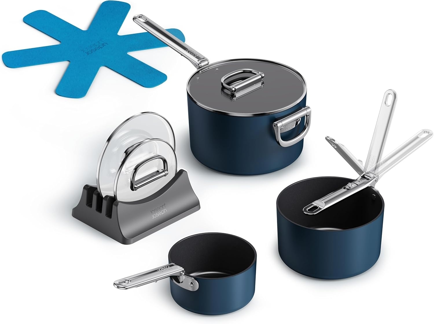 Joseph Joseph Space Kochset 3-teilig in Blau bietet Ihnen eine innovative Lösung für Ihre Kochbedürfnisse. Mit klappbaren Griffen aus rostfreiem Stahl und der SwingLock-Technologie sparen Sie bis zu 50 % Platz im Vergleich zu herkömmlichen Töpfen. Die schweren Aluminiumkorpusse und die ungiftige keramische Antihaftbeschichtung sorgen für eine einfache Handhabung und Reinigung. Das Set ist für verschiedene Kocharten geeignet und backofenfest bis 232 °C. **Highlights** - Klappbare Griffe aus rostfreiem Stahl für platzsparende Aufbewahrung - SwingLock-Technologie für zusätzliche Sicherheit - Spart bis zu 50 % mehr Platz als herkömmliche Töpfe - Ungiftige keramische Antihaftbeschichtung, frei von PTFE, PFAS, PFOA, Blei und Cadmium - Backofenfest bis 232 °C, Deckel bis 200 °C **Produkteigenschaften** - Material: Aluminium mit keramischer Antihaftbeschichtung - Geeignet für: Gas, Elektrik, Induktion, Keramik, Radiant Ring - Abmessungen (H x B x T) der Kasserolle 15 cm: 14,4 x 31,6 x 15,8 cm, Gewicht: 1,39 kg - Abmessungen (H x B x T) der Kasserolle 19 cm: 17,2 x 38 x 19,8 cm, Gewicht: 1,9 kg - Abmessungen (H x B x T) der Kasserolle 23 cm: 20 x 50,5 x 23,8 cm, Gewicht: 2,81 kg - Abmessungen (H x B x T) des Topfdeckelständers: 7,5 x 20 x 16,5 cm - Abmessungen (H x B x T) der Filz-Topfschoner: 0,6 x 45,7 x 45,7 cm **Lieferumfang** - 1x antihaftbeschichtete Kasserolle mit Deckel 15 cm Durchmesser - 1x antihaftbeschichtete Kasserolle mit Deckel 19 cm Durchmesser - 1x antihaftbeschichtete Kasserolle mit Deckel 23 cm Durchmesser - 1x Topfdeckelständer für drei Deckel - 2x Filz-Topfschoner