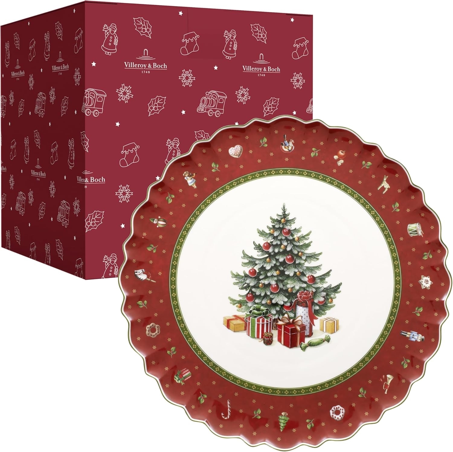 Die Villeroy & Boch Toy's Delight Kuchenplatte rund vereint nostalgischen Charme mit hochwertiger Verarbeitung. Die verspielten Motive in Rot, Grün und Weiß machen sie zum idealen Serviergeschirr für weihnachtliche Kuchen und Gebäck. Hergestellt aus Premium Porcelain, ist die Platte mikrowellengeeignet und sollte von Hand gereinigt werden. **Highlights** - Verspielt nostalgische Motive in Rot, Grün und Weiß - Hergestellt aus hochwertigem Premium Porcelain - Mikrowellengeeignet für vielseitige Nutzung - Ideal für weihnachtliche Kuchen und Gebäck - Lieferung in weihnachtlicher Geschenkverpackung **Produkteigenschaften** - Gewicht: ca. 1,02 kg - Länge: 340,00 mm - Breite: 340,00 mm - Höhe: 25,00 mm - Durchmesser: ca. 330 mm - Geschirrspülergeeignet: nein - Farbe: rot, weiß **Lieferumfang** - 1 x Villeroy & Boch Toy's Delight Kuchenplatte rund - Keine weiteren Produkte im Lieferumfang enthalten
