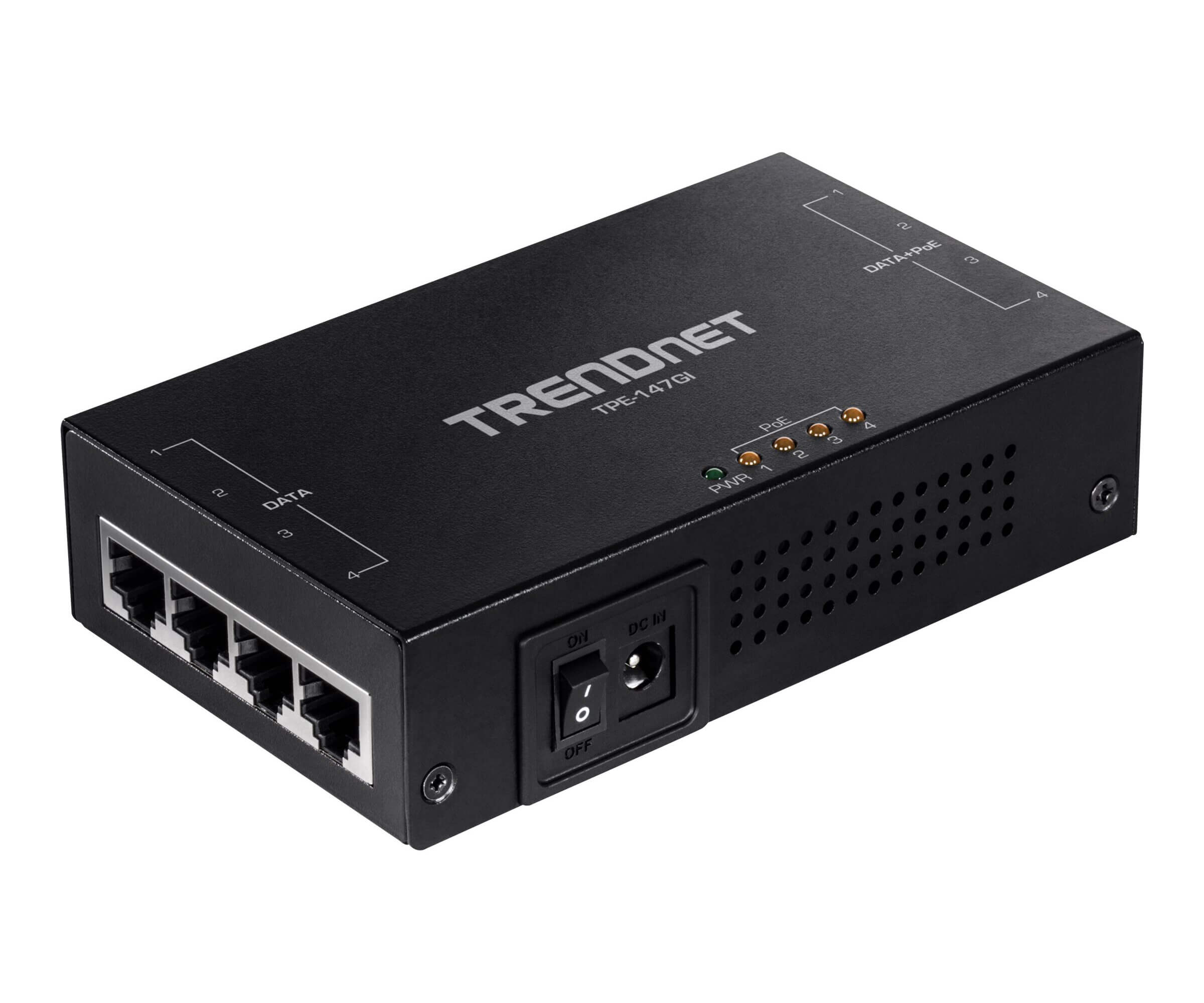 - Der TRENDnet TPE-147GI 65W PoE+ Injektor ermöglicht es, PoE+ Strom an einen Nicht-PoE-Switch anzuschließen.
