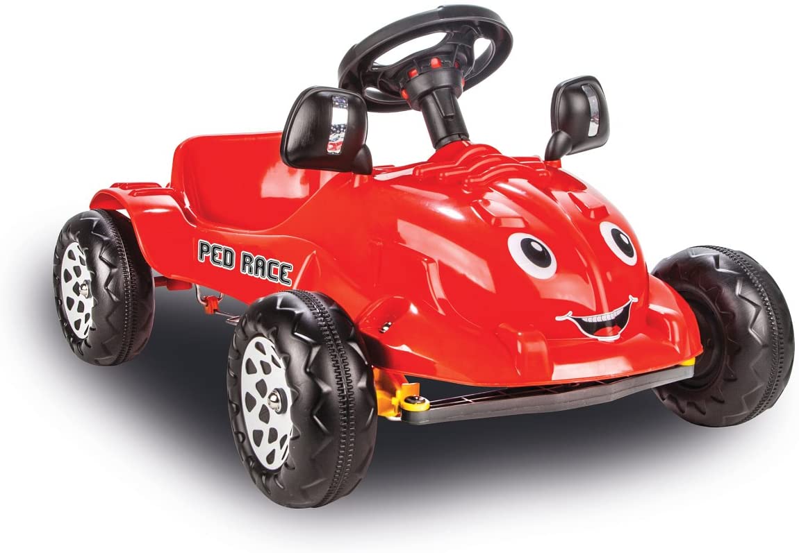 - Die knallige rote Farbe des Tretautos zieht die Aufmerksamkeit auf sich