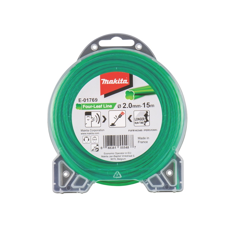 - Der Makita Mähfaden Four-Leaf hat einen Durchmesser von 2,0 mm und eine Länge von 15 m.
