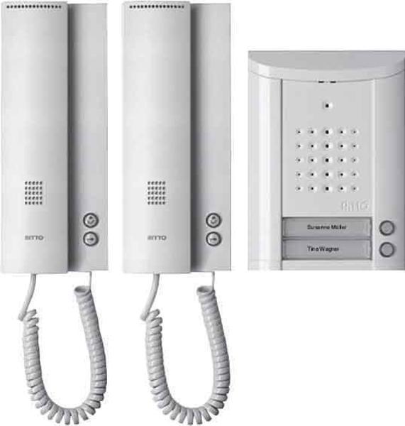 - Das Set umfasst zwei Haustelefone und einen Türlautsprecher.