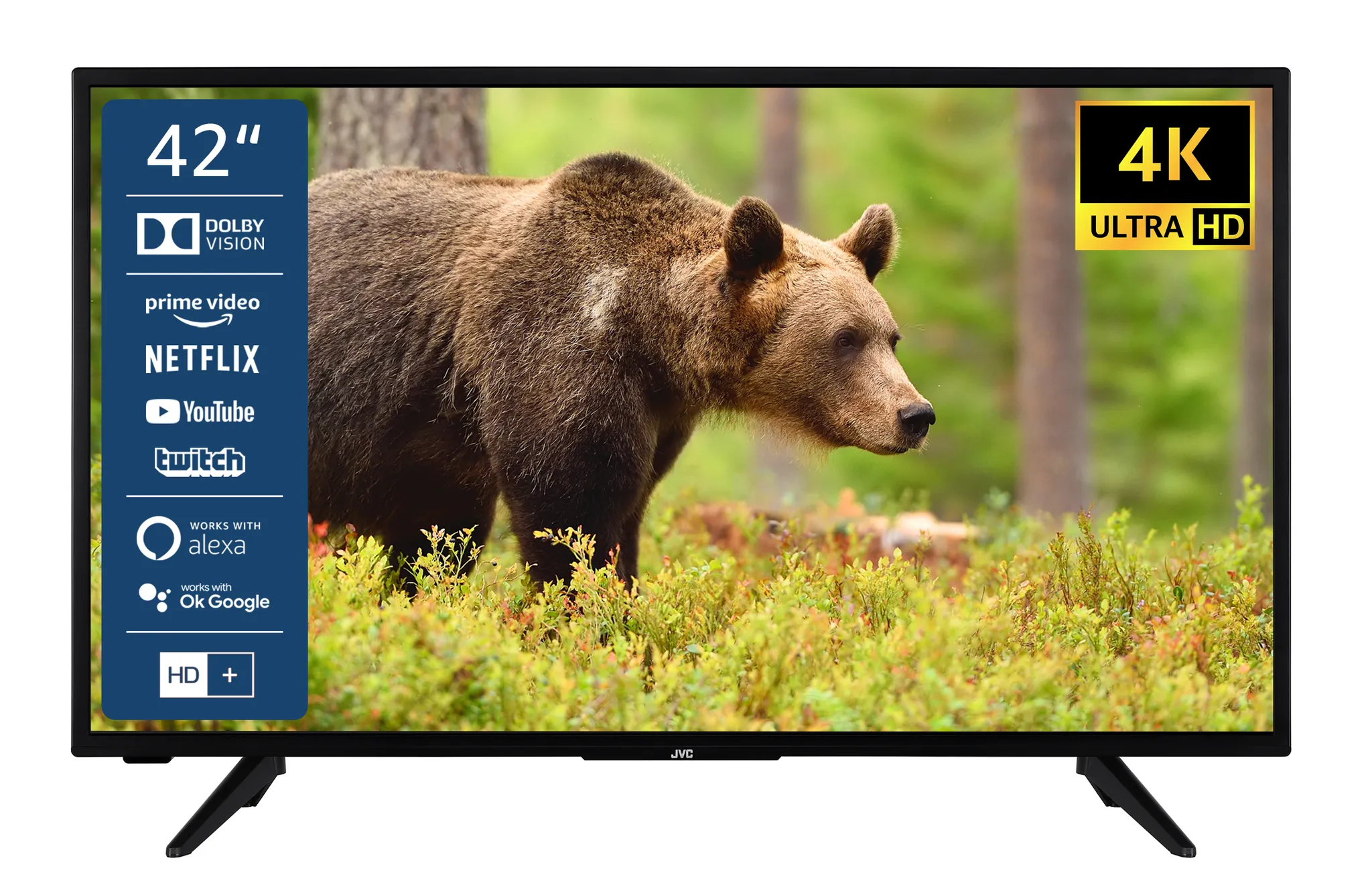 in Ultra-HD-FernseherJVC LT-42VU3155 106 cm (42 Zoll) LED Smart TV (Ultra HD, HDR, Edge LED) HD-Triple-Tuner (Sat, Antenne, Kabel) Modelljahr 2020 Energieklasse F (DE-Modell)