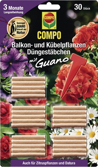- Die Compo Balkon- und Kübelpflanzen Düngestäbchen enthalten Guano und versorgen Pflanzen mit allen wichtigen Haupt- und Spurennährstoffen