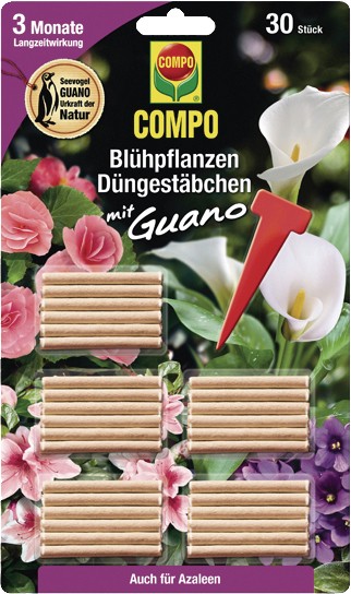 - Die Compo Düngestäbchen für Blühpflanzen enthalten Guano und versorgen die Pflanzen mit allen wichtigen Haupt- und Spurennährstoffen.