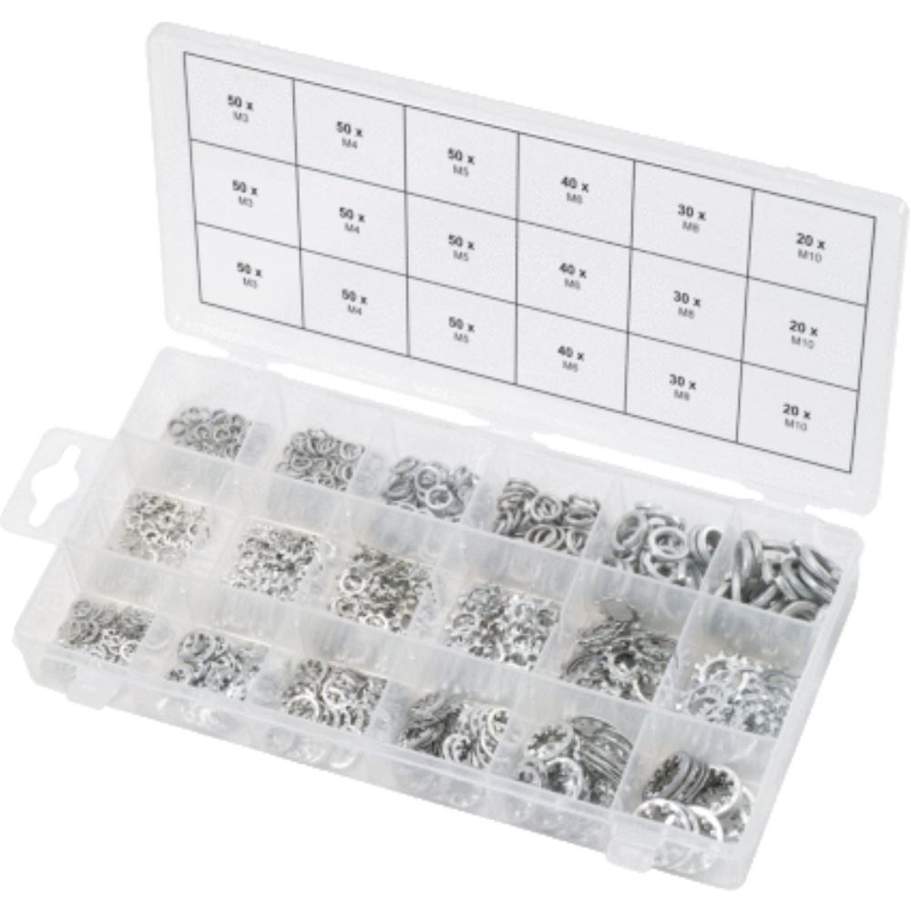 - Das Sortiment umfasst 720 Zahn-Unterlegscheiben in den Größen M3 bis M10.