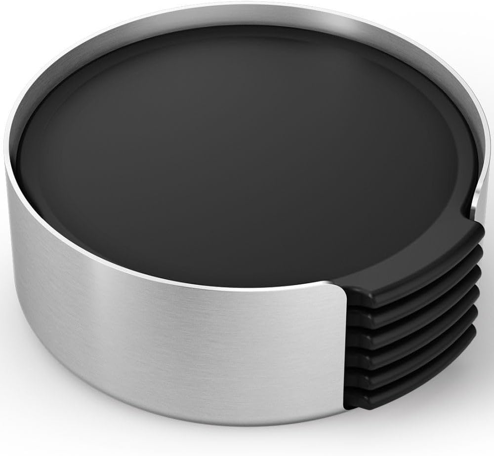- Das NORTA 6er Set Untersetzer für Gläser mit Halter von Zack bietet eine stilvolle Lösung für den Schutz empfindlicher Oberflächen. Die sechs Untersetzer aus hochwertigem Silikon bewahren Ihre Tische zuverlässig vor Glasabdrücken und Kratzern und verleihen jedem Raum durch ihr schlichtes Design eine elegante Note. - Der dazugehörige Halter aus edlem, matt gebürstetem 18/10 Edelstahl sorgt nicht nur für eine ordentliche Aufbewahrung, sondern ist auch ein echter Hingucker. An der Unterseite des Halters befindet sich ein EVA-Pad, das empfindliche Oberflächen vor Kratzern schützt und für einen sicheren Stand sorgt. Die Untersetzer haben mit ihrem Durchmesser von 9,4 cm die perfekte Größe für die meisten Gläser und lassen sich durch die kompakte Halterung platzsparend verstauen. - Mit einem Gesamtgewicht von 362 g und einer Höhe von 3,7 cm strahlt das NORTA Set Stabilität und hochwertige Verarbeitung aus. Dieses elegante Accessoire von Zack ist die ideale Wahl für alle, die Funktionalität mit zeitlos schönem Design verbinden möchten.