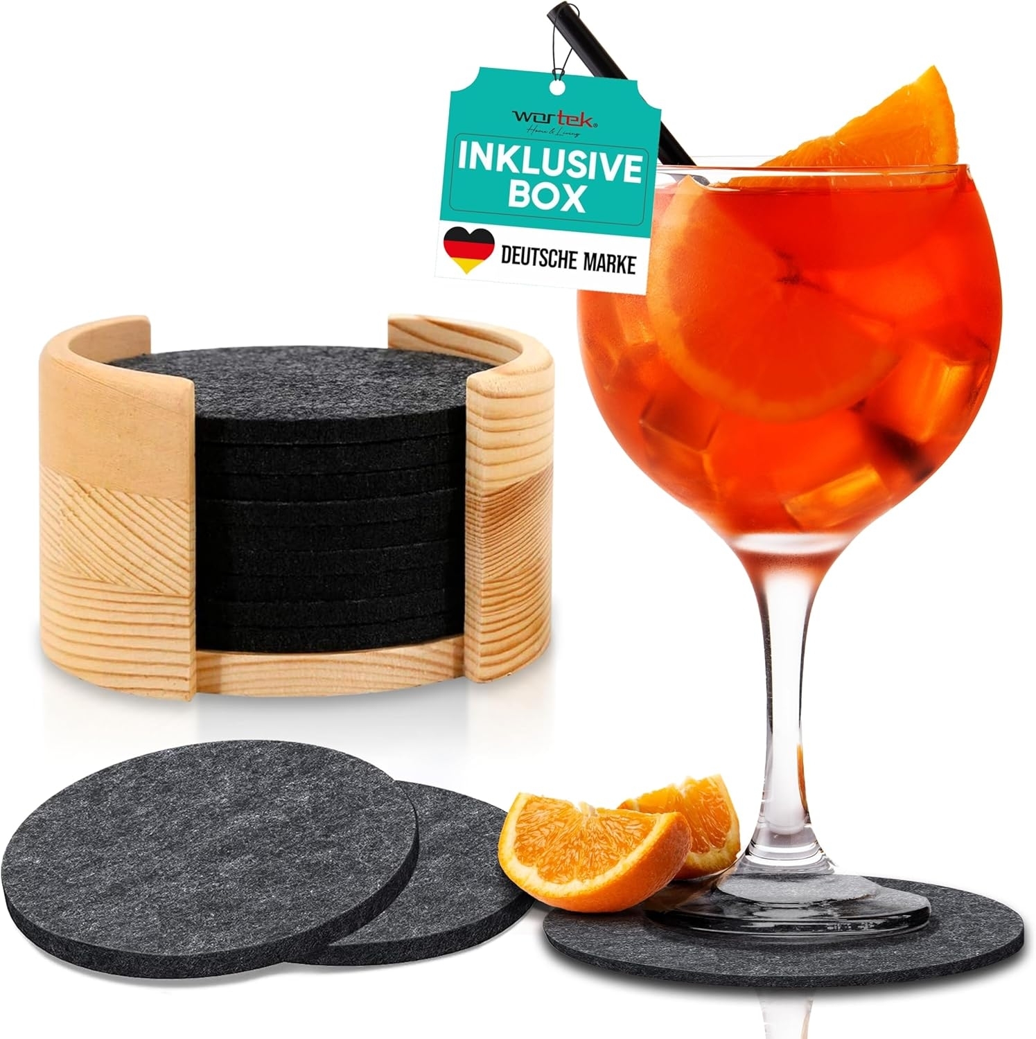| Name | wortek Getränkeuntersetzer Filz-Untersetzer 10 Stück + Box, Anthrazit, Zubehör für Tisch & Gläser, Tassen, Bar, Glasuntersetzer Ø 10 cm inkl. Holzhalterung, waschbar |