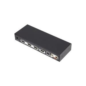 - Ein integrierter Audio Extractor separiert das Audio-Signal und gibt es über Toslink oder Cinch aus.