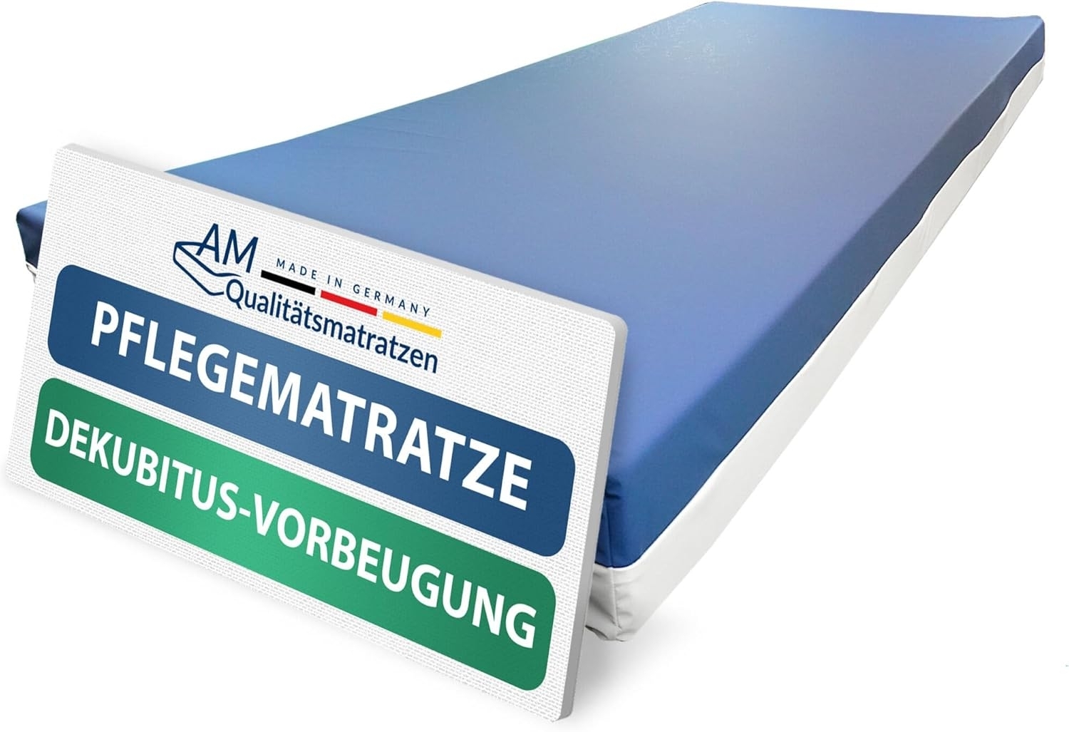**Premium Anti-Dekubitusmatratze** * Unterstützung der Dekubitus-Prophylaxe * Visco- & Komfortschaumseite (weicher & fester) * Feste Sitzkanten dank Randzonenverstärkung * Hergestellt in Deutschland **Beschreibung** **Die Premium Anti-Dekubitusmatratze** von AM Qualitätsmatratzen sorgt für eine angemessene Druckentlastung und dient somit zur Dekubitusprophylaxe. Sie besteht aus einem 14 cm hohen Matratzenkern und eignet sich für Personen mit einem Körpergewicht von maximal 120 kg. Die Pflege-Matratze unterstützt die Dekubitusbehandlung der Dekubitusgrade 1-2, wenn alle anderen pflegerischen Maßnahmen berücksichtigt werden. **Hochwertiger Matratzenkern:** Feste Sitzkanten dank Randzonenverstärkung (RG 40) sorgen für einen stabilen Sitz der Patienten. Die **weiche Oberseite** besteht aus einem 5 cm dicken Visco-druckentlastenden Schaum (RG 50). Die **festere Unterseite** setzt sich aus einem Komfortschaum mit einer Höhe von 9 cm zusammen (RG 35). **Der Matratzenbezug** (45% Polyester, 55% Polyurethan) ist auf der einen Seite blau (Visco-druckentlastende Seite) und auf der anderen Seite weiß (Komfortschaum-Seite). Er hat einen zwei-Seiten-Reißverschluss und ist abwaschbar, sowie wasser- und bakteriendicht. Zudem ist das Gewebe kochfest, trocknerfest, chemisch reinigungsbeständig sowie dampfsterilisierbar und dauerhaft beständig gegen Blut, Urin, Öle, Fette und Desinfektionsmittel. **Zertifiziert:** Unsere Pflegematratze ist Oeko-Tex® Standard 100 zertifiziert (19.0.86717 Hohenstein HTTI). Alle verarbeiteten Materialien sind auf Schadstoffe geprüft und für Allergiker geeignet. **Qualität Made in Germany:** Unsere Matratzen werden komplett in Deutschland gefertigt. Sogar die Bezüge werden in Deutschland genäht und nicht nur über den Matratzenkern gezogen, wie bei vielen anderen Angeboten, die mit Made in Germany werben. **Zufriedenheitsgarantie:** Wir sind von unserer Qualität überzeugt und möchten auch Sie überzeugen. Deshalb: **30 Nächte Probeschlafen**. Wenn Sie nicht zufrieden sind, holen wir die Matratze kostenlos wieder bei Ihnen ab. Ohne Wenn und Aber!