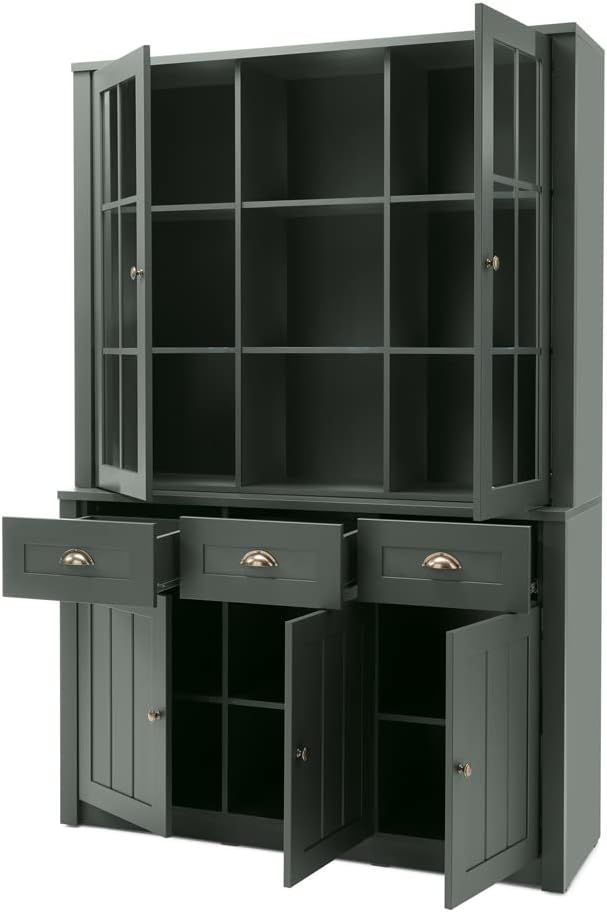 - Er verfügt über eine praktische Aufteilung mit 3 Türen, 3 Schubkästen und einem Buffetaufsatz mit 2 Glasrahmentüren.