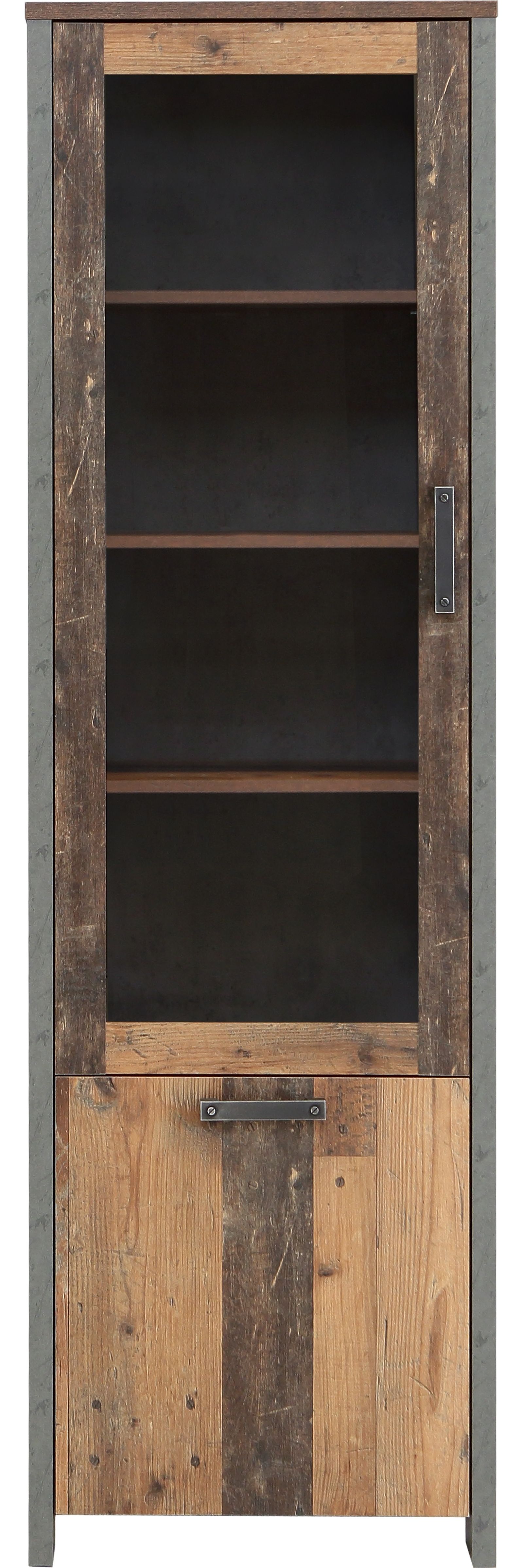 Die FORTE Clif Vitrine in Grau/Braun besticht durch ihr rustikales Design mit einem Old-Wood Vintage Look und trendiger Betonoptik. Ideal für moderne oder Industrial-Einrichtungen. Die Vitrine bietet geschlossenen Stauraum hinter der Tür und präsentiert Geschirr hinter der Glastür. Robuste Metallauszüge, schwarze Kunststoffgriffe und optionale Beleuchtung IZLED282P03-WK01 erhältlich. Einfache Montage, pflegeleichte Oberfläche und widerstandsfähige ABS-Kantenumleimer. **Highlights** - Rustikales Design im Old-Wood Vintage Look - Kombination mit trendiger Betonoptik - Geschlossener Stauraum hinter der Tür - Präsentationsmöglichkeit hinter der Glastür - Robuste Metallauszüge für die Schubladen **Produkteigenschaften** - Maße: 62 x 204,7 x 41,6 cm - Farbe: Grau/Braun - Material: Holzwerkstoff - Schwarze Kunststoffgriffe - Optionale Beleuchtung IZLED282P03-WK01 erhältlich - Wandmontage erforderlich (inklusive Beschlag) - Pflegeleichte Oberfläche - Widerstandsfähige und beschädigungssichere ABS-Kantenumleimer
