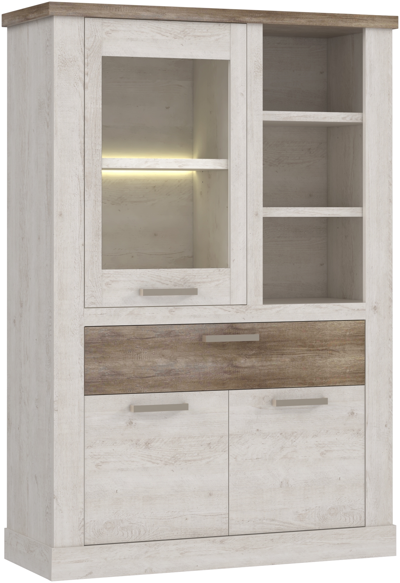 Bringen Sie mit dieser Vitrine im modernen Landhausstil einen gemütlichen Flair in Ihre Wohnung. Die harmonierende Farbkombination Pinie weiß und Eiche antik sorgt für eine beruhigende Atmosphäre in Ihrem Wohnzimmer. Dieses Highboard mit 1 Glastür, 2 Holztüren, 1 Schubkasten und 3 Fächern bietet Ihnen jede Menge Stauraummöglichkeiten. - **Ausführung**: 1x Vitrine DURO Front und Korpus: Pinie weiß, Dekor Absetzungen: Eiche antik, Dekor 2x Holztür 1x Glastür 1x Schubkasten auf Metalllaufleisten 3x Fach Griff: Metallgriffe Nickel matt Zerlegte Ware - Eine bebilderte Aufbauanleitung für die Endmontage liegt bei! - **Maße**: B/H/T: ca. 109,8/160,3/41,3 cm - **Besonderheit:** Schubkasten auf Metalllaufleisten! - **Lieferumfang:** Originalverpackte Neuware Angebot ohne Beleuchung, Beimöbel und Dekoration