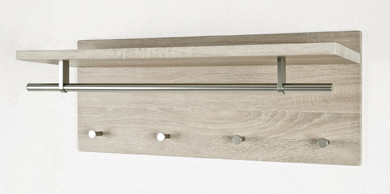| Beschreibung | Wandgarderobe WINTON Ausführung: Eiche-Edelstahloptik vier Garderobenhaken eine Stange für die Kleiderbügel eine Hutablage |