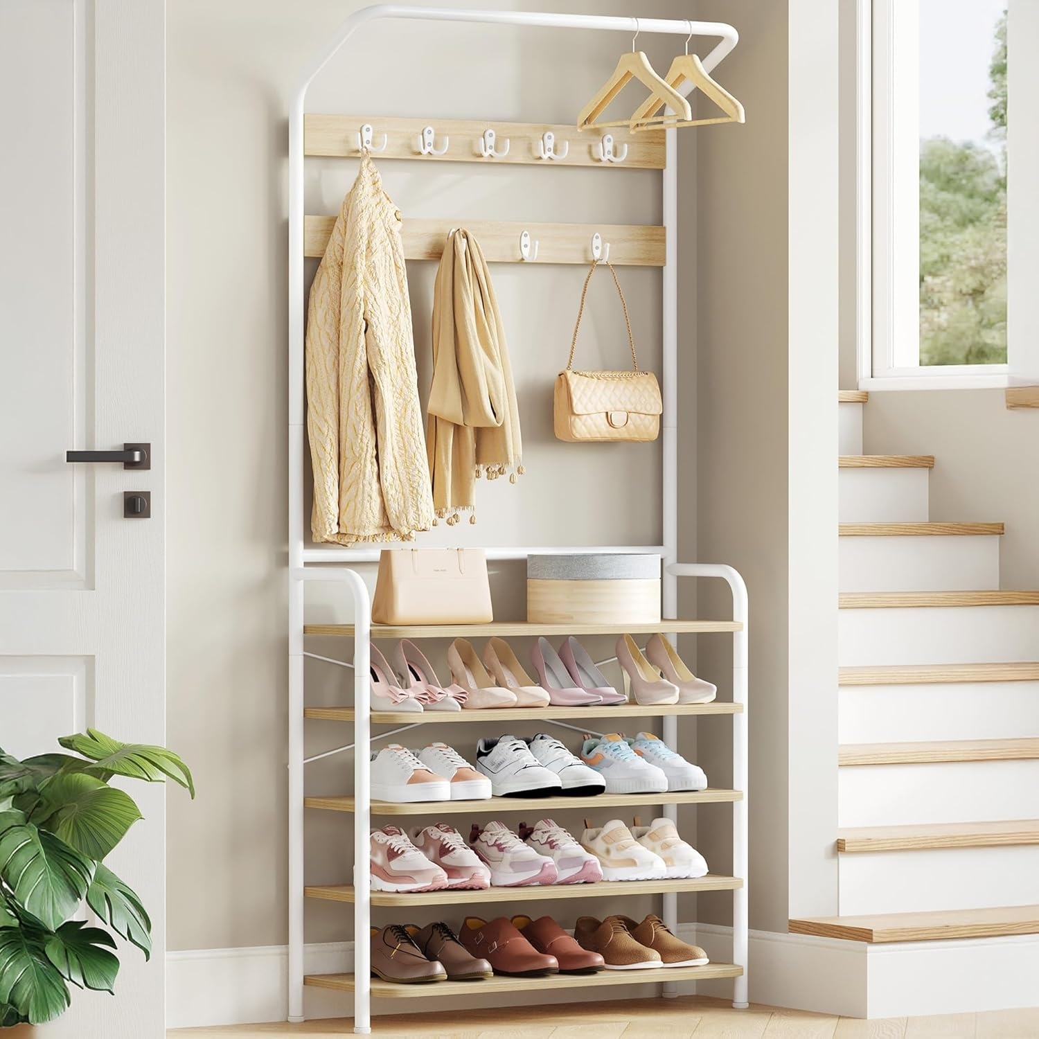 in WandhakenGarderobenständerGarderobe mit 5 Regalböden des Schuhregals, 1 Kleiderstange, 9 Haken, Freistehender Kleiderständer für Flur, Eingang, 24,5 x 78,5 x 195 cm, Eichenfarben-Weiß