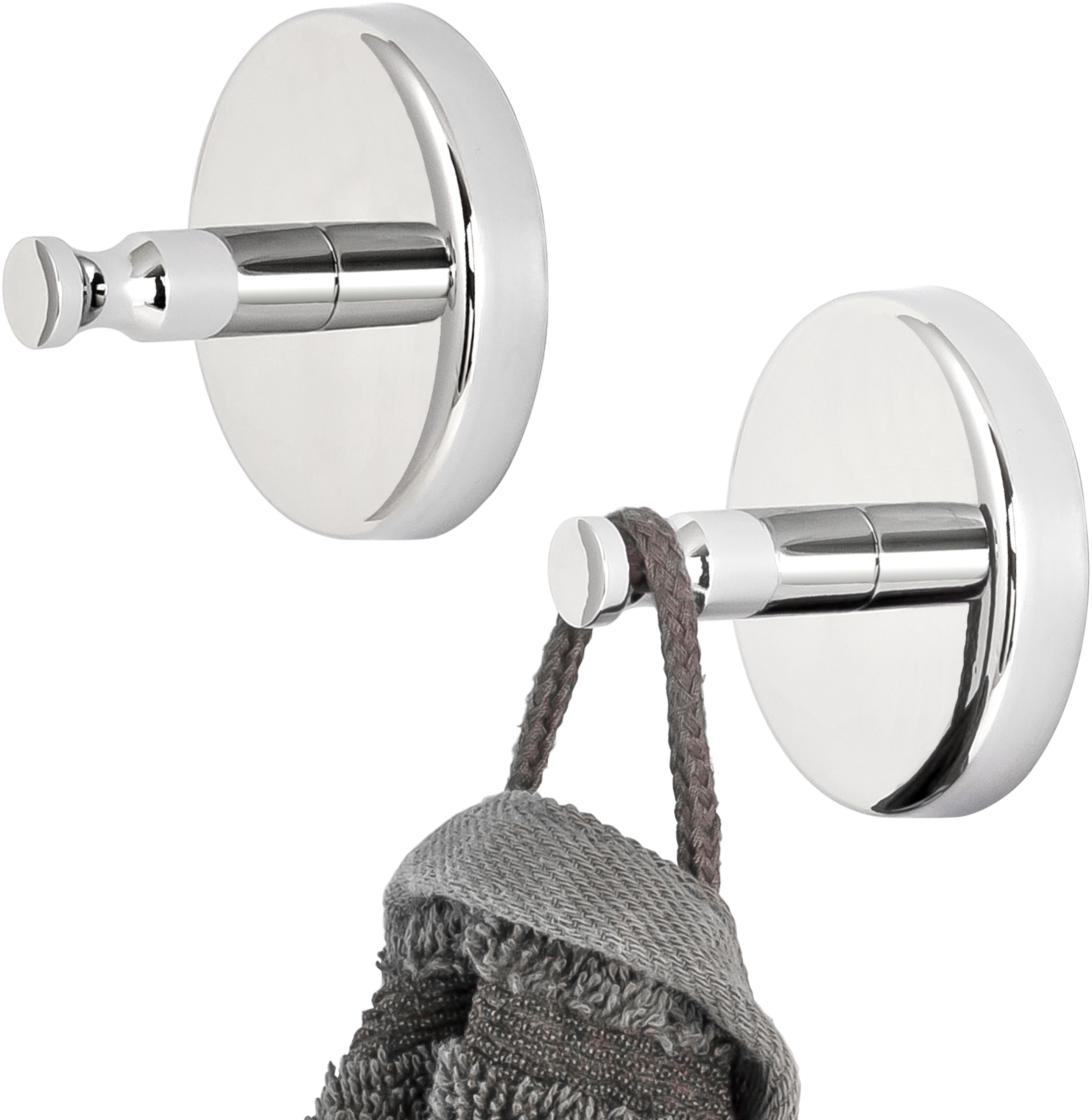 Die Bad-Serie LUCENTE von bremermann vereint elegantes Design und Funktionalität. Die Handtuchhaken aus hochwertigem, rostfreiem Edelstahl sind hochglänzend verchromt und bieten eine ansprechende Optik sowie hohe Widerstandsfähigkeit. Mit einem Durchmesser von ca. Ø 6 cm und einer Tiefe von 4,5 cm ermöglichen sie ein einfaches Aufhängen und Entnehmen von Handtüchern und anderen Utensilien. Ideal für Bad und Küche. **Highlights** • elegant und zeitlos • einfaches Aufhängen und Entnehmen • praktisch und funktional für Bad und Küche • ideal für Handtücher, Geschirrtücher, Bademäntel und Badutensilien • zur Wandmontage mittels Schrauben **Produkteigenschaften** • Material: hochwertiger, rostfreier Edelstahl (hochglänzend) verchromt • Abmessungen: ca. Ø 6x4,5 cm T • inklusive Befestigungsmaterial & Montageanleitung **Lieferumfang** - 1x Handtuchhaken 2er Set LUCENTE