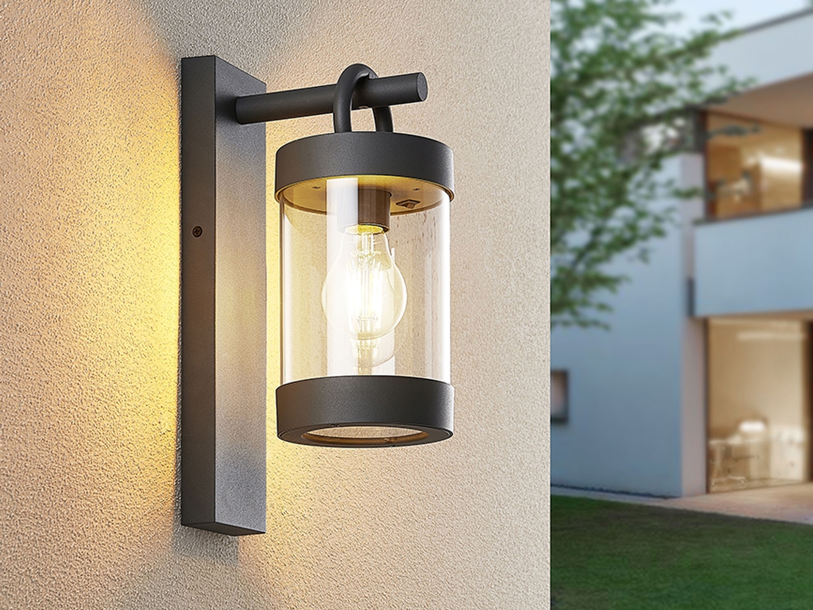 | Beschreibung | Die Wandleuchte SAMBESI ist ein außergewöhnliches und funktionales Leuchtendesign für den Außenbereich. Mit ihrem traditionellen und dennoch modernen Design wird sie zum Hingucker an Ihrer Außenfassade. Die Leuchte sorgt für ein angenehmes Lichtambiente und verfügt über einen Dämmerungssensor, der bei Bedarf ausgeschaltet werden kann. Dank des witterungsbeständigen Druckgussaluminiums und der Schutzart IP44 ist die Leuchte ideal für den Außenbereich geeignet. Mit einer Größe von 12,5x33 cm und ihrem anthrazitfarbenen Design lässt sie sich vielfältig kombinieren und verleiht Ihrem Außenbereich ein modernes Erscheinungsbild. Für eine energiesparende Beleuchtung empfehlen wir die Verwendung eines LED Leuchtmittels. Die Wandleuchte hat eine Fassungsgröße von 1 x E27 max. 28 W (Leuchtmittel nicht im Lieferumfang enthalten). **Highlights** - Außergewöhnliches und funktionales Leuchtendesign - Angenehmes Lichtambiente - Dämmerungssensor mit integriertem Schalter - Witterungsbeständiges Druckgussaluminium - Schutzart IP44 **Produkteigenschaften** - Größe: 12,5x33 cm - Farbe: Anthrazit - Fassungsgröße: 1 x E27 max. 28 W - Material: Druckgussaluminium - Schutzart: IP44 **Lieferumfang** - Wandleuchte SAMBESI Aussenleuchte Dämmerungssensor 33 cm hoch |