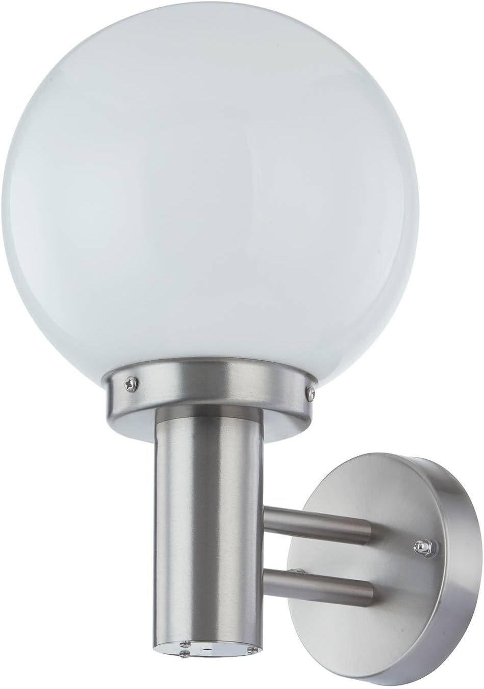 - Die Außen-Wandleuchte Nada ist aus Edelstahl gefertigt und verfügt über einen kugelförmigen, opalweißen Glasschirm.