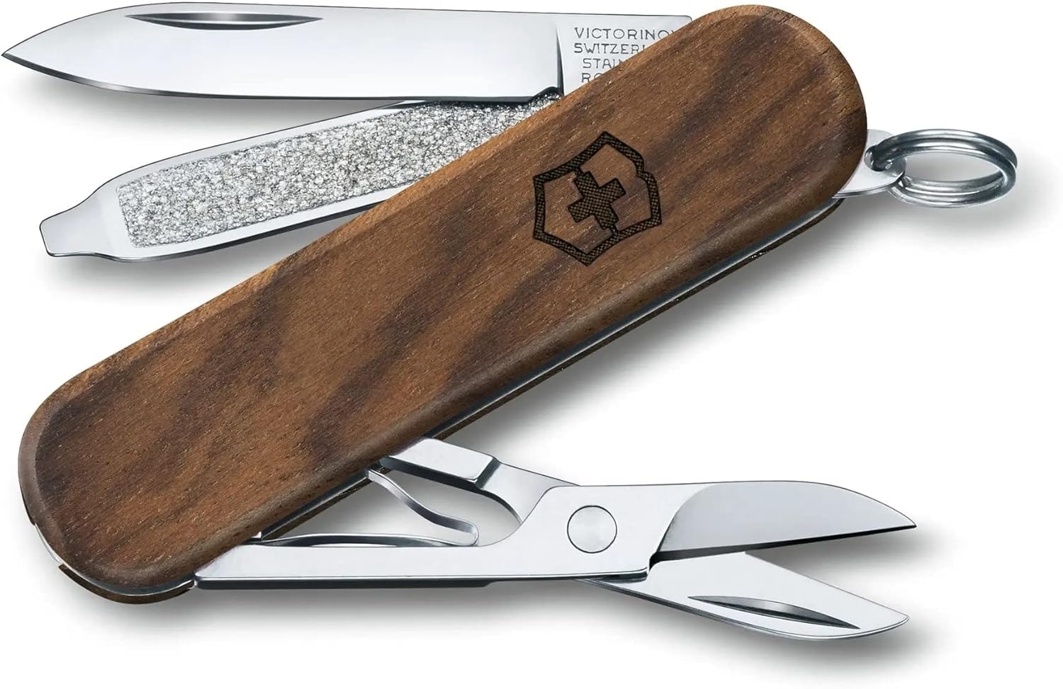 Das Victorinox Classic SD Wood Taschenwerkzeug in Braun ist ein unverzichtbarer Begleiter für jede Situation. Mit elegantem europäischem Nussbaumholz und einer natürlichen Maserung ist jedes Messer ein Unikat. Das Taschenwerkzeug bietet 5 Funktionen in einem klassischen Design mit höchster Funktionalität. Hergestellt in der Schweiz, nachhaltig und stilvoll. **Highlights** - Klassisches Design mit einem Twist: Einzigartiges Design kombiniert mit optimaler Performance. - Nachhaltiges europäisches Nussbaumholz: Stilvoll und umweltfreundlich. - 5 Funktionen in einem Taschenwerkzeug: Vielseitig einsetzbar für verschiedene Aufgaben. - Hergestellt in der Schweiz: Schweizer Qualität und Präzision. - Natürliche Maserung: Jedes Messer ist ein Unikat. **Produkteigenschaften** - Marke: Victorinox - Höhe: 9 mm - Länge: 58 mm - Material: Europäisches Nussbaumholz - 5 Funktionen - Nachhaltig und stilvoll - Hergestellt in der Schweiz