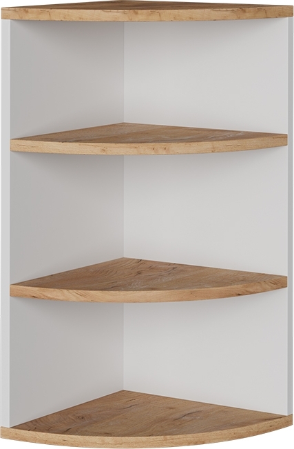 Das Vicco Eckregal Ecki in Weiß und Goldkraft Eiche ist die ideale Lösung für stilbewusste Raumgestalter. Mit seinen kompakten Maßen von 30 x 60 x 30 cm fügt sich das halbkreisförmige Regal perfekt in jede Ecke ein und bietet auf 3 offenen Ablagen ausreichend Platz für Bücher und Dekoration. Die Wandhalterung sorgt für eine sichere Befestigung, während die Melaminharzbeschichtung für eine ansprechende Oberfläche sorgt. **Highlights** - Halbkreisförmige Form für optimale Raumnutzung - 3 offene Ablagen für vielseitige Nutzung - Einfache und sichere Wandbefestigung - Melaminharzbeschichtung für langlebige Oberfläche - Kombinierbar mit anderen Möbeln **Produkteigenschaften** - Farben: Weiß, Goldkraft Eiche - Maße (BxHxT): 30 x 60 x 30 cm - Material: Spanplatte, 16 mm - Artikelgewicht: 6,4 kg - Artikelgewicht inkl. Verpackung: 7,8 kg **Lieferumfang** - Eckregal - Montageanleitung - Montagematerial - Dekoration nicht enthalten