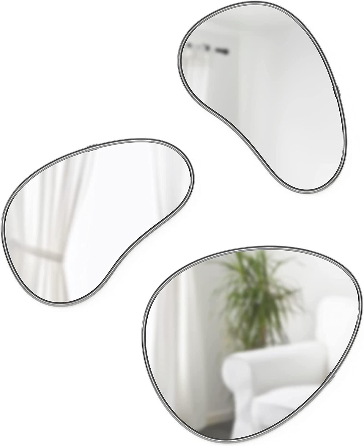 HUBBA Pebble 3 organisch geformter Wandspiegel in Titan bietet ein modernes Design mit organischen Formen, das Ihrem Raum Dimension und Tiefe verleiht. Die Spiegel sind einfach zu installieren und beschädigen Ihre Wände nicht, da sie mit abziehbaren Klebestreifen befestigt werden. Der dünne Metallrahmen unterstreicht das verspielte und moderne Erscheinungsbild. **Highlights** - Modernes Design mit organischen Formen: Verleiht dem Raum Dimension und Tiefe. - Einfache Installation: Mit abziehbarem Klebestreifen. - 3er-Set: Enthält verschiedene Spiegel aus der beliebten Hubba Kollektion. - Dünner Metallrahmen: Unterstreicht das moderne Erscheinungsbild. - 5 Jahre Garantie: Hohe Qualität mit Hersteller-Garantie. **Produkteigenschaften** - Maße: 25 x 1 x 31 cm - Farbe: Titan - Material: 60% Spiegelglas, 20% MDF, 20% PVC - Teil der Hubba Spiegel Kollektion - Leicht zu installieren mit abziehbarem Klebestreifen - Gewicht: 1,03 kg **Lieferumfang** - 3x Wandspiegel - Abziehbare Klebestreifen - Ausschluss von weiteren Spiegeln oder Zubehör