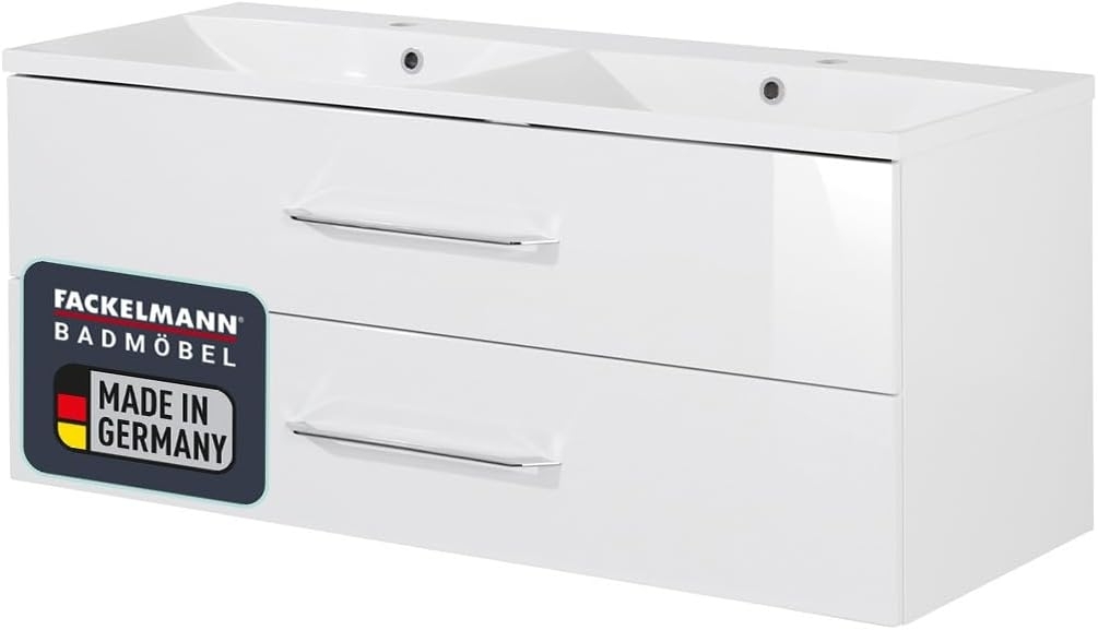 Das Fackelmann B.CLEVER Doppel-Waschtisch Set ist die ideale Lösung für moderne Familienbäder. Mit einer Breite von 120 cm bietet der Waschtisch aus Gussmarmor ausreichend Platz. Der Waschtischunterschrank in Weiß verfügt über zwei geräumige Schubladen mit Soft-Close-System für eine leise Schließung. Die hochglänzende Front verleiht dem Set eine elegante Note. Das Set wird zerlegt geliefert und ist einfach zu montieren. **Highlights** - Doppel-Waschtisch mit 120 cm Breite - Hochglänzende Front in Weiß - Zwei geräumige Schubladen mit Soft-Close-System - Hergestellt in Deutschland - Einfache Montage **Produkteigenschaften** - Maße Waschtischunterschrank: 119 cm (B) x 48,3 cm (H) x 45,7 cm (T) - Maße Gussmarmor-Doppel-Waschtisch: 120 cm (B) x 14 cm (H) x 46 cm (T) - Material: Gussmarmor - Farbe: Weiß - Ausstattung Waschtischunterschrank: 2 Auszüge mit Einzugsdämpfung, 2 Griffe in Chrom glänzend - Besonderheit Gussmarmor-Doppel-Waschtisch: Hahnlochbohrung, Überlaufloch **Lieferumfang** - 1x Waschtischunterschrank - 1x Gussmarmor-Doppel-Waschtisch - Montageanleitung