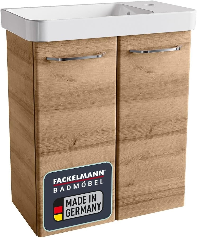 Das Fackelmann MILANO Gäste-WC Set ist die ideale Lösung für kleine Badezimmer oder Gäste-WCs. Es besteht aus einem Waschbecken und einem Waschbeckenunterschrank mit 2 Türen in einem modernen, hellen Braun. Mit einer Breite von ca. 55 cm bietet es ausreichend Stauraum und überzeugt durch ein praktisches Soft-Close-System, das ein sanftes Schließen der Türen ermöglicht. **Highlights** - Soft-Close-System: Die Türen des Waschbeckenunterschranks schließen sanft und geräuschlos. - Modernes Design: Das exklusive und formvollendete Design macht das Set zu einem Blickfang in jedem Bad. **Produkteigenschaften** - Farbe: Braun hell - Material: Korpus und Front aus hochwertigem Material - Breite: 55 cm - Waschbecken Maße: 56 cm Breite, 26 cm Höhe, 30 cm Tiefe, Stärke 6 cm - Waschbecken Material: Keramik - Waschtischunterschrank Maße: 52 cm Breite, 61 cm Höhe, 28 cm Tiefe - Ausstattung: 2 Türen, 1 Einlegeboden, gedämpfte Scharniere - Montageart: zerlegt, hängend - Made in Germany **Lieferumfang** - 1 x zerlegtes Badmöbel-Set MILANO - Breite: ca. 55 cm - Waschbecken (Art. Nr. 82396) - Waschtischunterschrank (Art. Nr. 84332)
