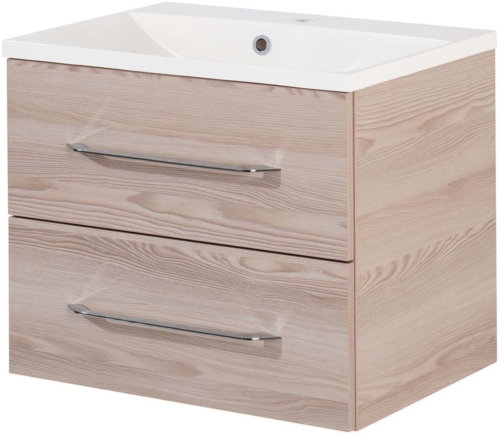 Der Fackelmann B.CLEVER Waschtisch 2-teilig in Braun hell aus Gussmarmor ist die ideale Lösung für moderne Badezimmer. Mit einer Breite von 60 cm eignet sich dieses Set perfekt für kleinere Bäder und Gäste-WCs. Der Waschtischunterschrank in der Farbe Alaska Esche bietet mit zwei Schubladen ausreichend Stauraum. Das sanft geschwungene Waschbecken aus weißem Gussmarmor ergänzt den Unterschrank harmonisch. Die Schubladen schließen dank des Soft-Close-Systems sanft und geräuschlos. **Highlights** - Modernes Design mit sanft geschwungenem Waschbecken - Zwei Schubladen mit Soft-Close-System für geräuschloses Schließen - Breite von 60 cm für kleinere Bäder und Gäste-WCs **Produkteigenschaften** - Waschtischunterschrank: 59,2 cm Breite, 48,3 cm Höhe, 45,7 cm Tiefe - Ausstattung: 2 Auszüge mit Einzugsdämpfung, 2 Griffe, Chrom glänzend - Farbe: Korpus und Front in Braun hell / Design Alaska Esche - Made in Germany - Produktion in Hersbruck bei Nürnberg - Gussmarmor-Doppel-Waschtisch: 60 cm Breite, 14 cm Höhe, 46 cm Tiefe - Material: Gussmarmor, weiß - Ausstattung: Hahnlochbohrung, Überlaufloch - Besonderheit: tiefe Waschmulde **Lieferumfang** - 1x Waschtischunterschrank - 1x Gussmarmor-Doppel-Waschtisch - Montageanleitung