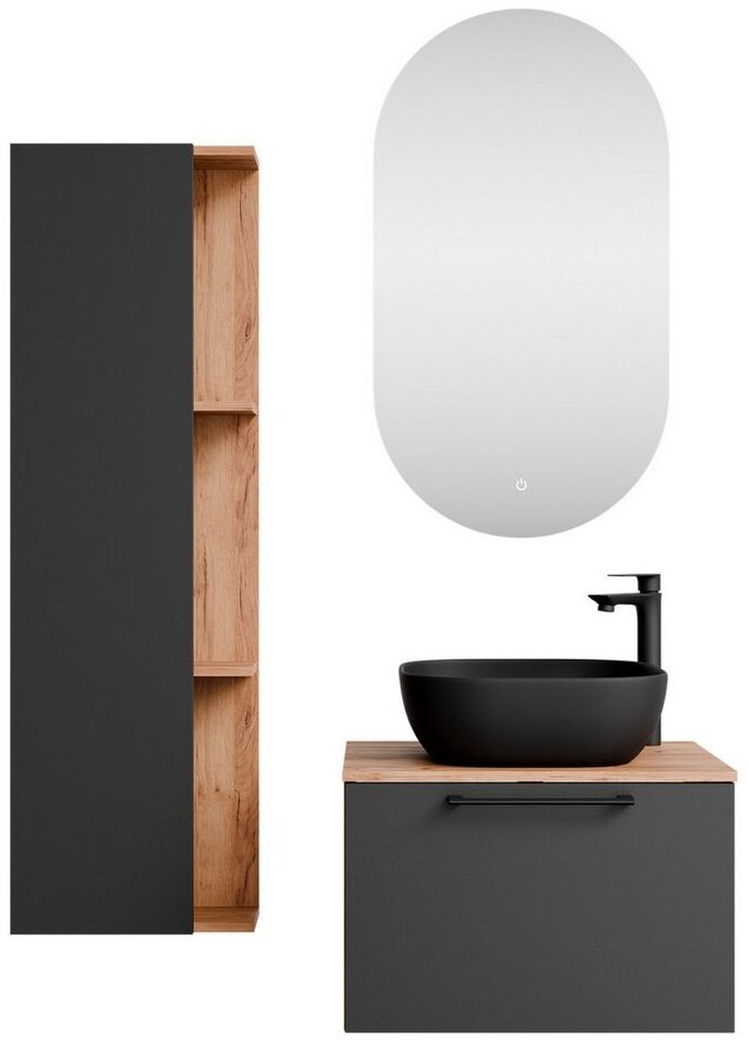 Mit dem Planetmöbel Badmöbel-Set Astra gestalten Sie Ihr Badezimmer nach Ihren Vorstellungen. Das Set umfasst einen eleganten Waschtisch mit einem schwarzen Aufsatzwaschbecken, einen Spiegel mit LED-Beleuchtung und einen praktischen Midischrank. Die innovative Soft-Close-Funktion sorgt für geräuschloses Öffnen und Schließen, während das großzügige Staufach für eine ordentliche Aufbewahrung Ihrer Badutensilien sorgt. **Highlights** - Soft-Close-Funktion für geräuschloses Schließen - Eleganter schwarzer Waschtisch mit Waschbecken - Inklusive Spiegel mit LED-Beleuchtung - Praktischer Midischrank für zusätzlichen Stauraum - Modernes Design für eine entspannende Atmosphäre **Produkteigenschaften** - Waschtisch: 60 x 40 x 42 cm (BxTxH) - Aufsatzwaschbecken: 42,5 x 14 x 42,5 cm (BxHxT) - Midischrank: 30 x 75 x 32 cm (BxHxT) - Spiegel (mit LED): 50,7 x 90 x 7 cm (BxHxT) - Material: Holzwerkstoffe mit Melaminbeschichtung **Lieferumfang** - 1x Waschtisch-Korpus - 1x Aufsatzwaschbecken - 1x Midischrank - 1x Spiegel (mit LED) - Befestigungsmaterial (kein Silikon enthalten) - Aufbau-/Montageanleitung - Achtung: Ablaufventil ohne Überlauf und Siphon nicht im Lieferumfang enthalten