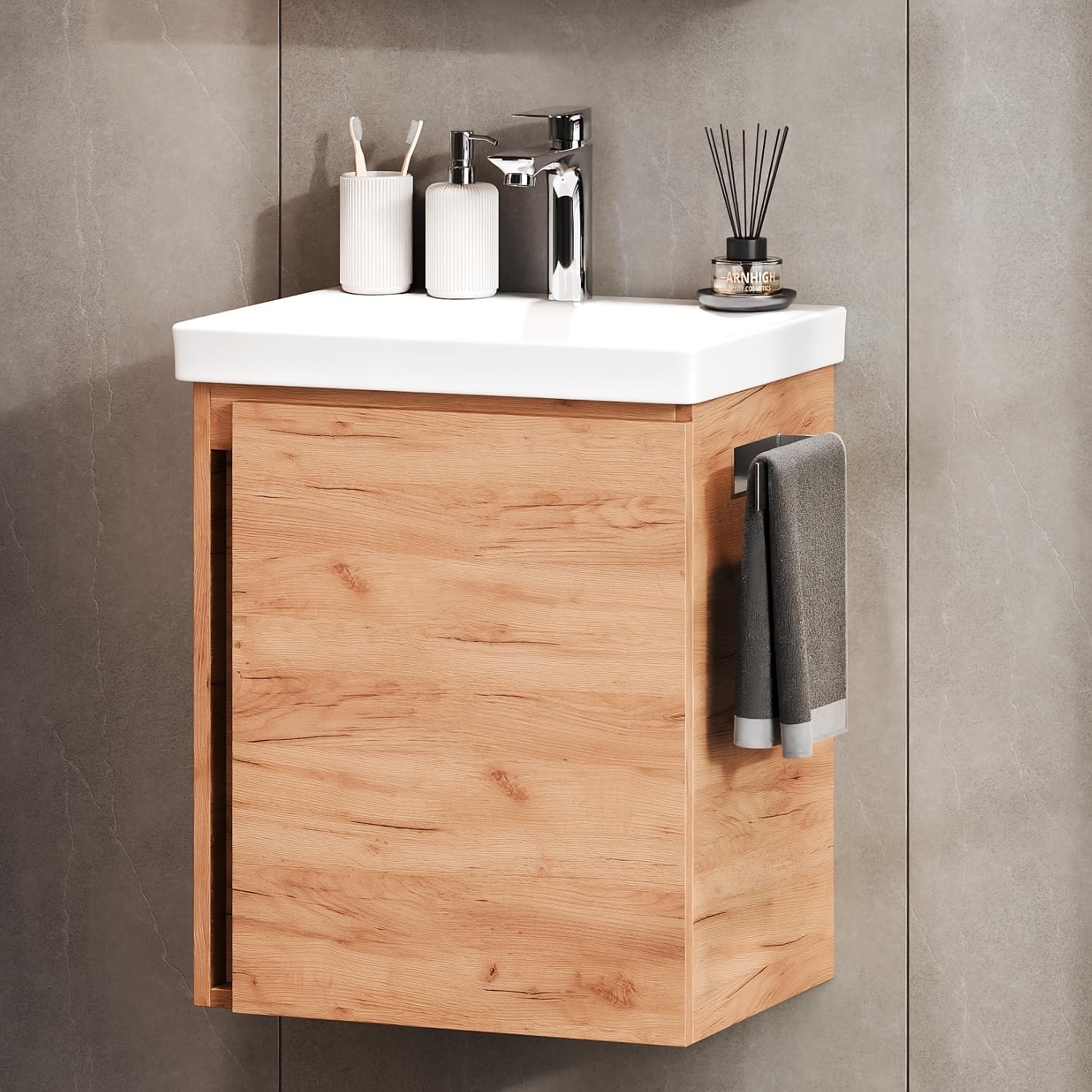 Der Planetmöbel Waschtischunterschrank 50 cm Gold Eiche mit Armatur Chrom ist ein schicker und praktischer Waschtisch im modernen Design. Mit geräumigen Fächern im Inneren des Schranks können Sie Ihre Produkte einfach und sauber sortieren. Das Highlight ist das Keramikbecken. Die Schranktür lässt sich dank der Soft-Close-Funktion geräuschlos schließen und öffnen. Der Waschtisch ist vormontiert und die Montageanleitung ist bildlich dargestellt, was einen schnellen und einfachen Aufbau ermöglicht. Mit den Maßen 49 x 59 x 37 cm (B,H,T) bietet der Waschtisch viel Stauraum. Sie haben die Qual der Wahl zwischen fünf tollen Dekorfarben: Sonoma Eiche, Gold Eiche, Anthrazit, Beton oder Weiß. Im Lieferumfang enthalten sind der Waschtischunterschrank und das Keramikwaschbecken. **Highlights** - Geräuschloses Schließen und Öffnen der Schranktür dank Soft-Close-Funktion - Vormontiert für eine einfache Platzierung - Großer Stauraum durch geräumige Fächer im Inneren des Schranks - Modernes Design mit einem Highlight-Keramikbecken - Schneller und unkomplizierter Aufbau dank bildlicher Montageanleitung **Produkteigenschaften** - Maße inkl. Waschbecken: 49 x 59 x 37 cm (B,H,T) - Material: Gold Eiche - Farbe: Gold Eiche - Armatur: Chrom **Lieferumfang** - 1 x Waschtischunterschrank - 1 x Keramikwaschbecken