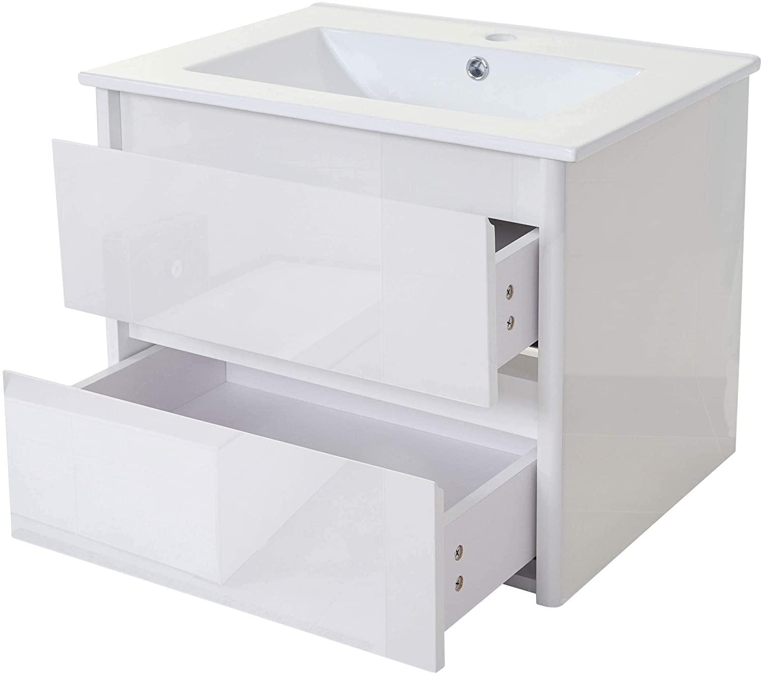 * Lieferumfang: 1x Waschbeckenunterschrank inkl. Waschbecken * Soft-Close-System * Zur Wandmontage * Hochglanz-Optik * 2 Schubladen * Waschbecken aus Keramik * Inkl. Aussparung für Siphon * Inkl. Befestigungsmaterial * Armatur, Abfluss und Siphon sind nicht im Lieferumfang enthalten **Maße** (HxBxT) (ca.): Gesamtmaße: 50 x 61 x 47 cm Innenmaße Schublade: 5 x 49,5 x 33 cm Aussparung in der oberen Schublade: 13,5x22 cm Abflussöffnung: Ø 4,5 cm **Material**: Waschbecken: Keramik Waschbeckenunterschrank: 16mm Sperrholz, hochglanz weiß, schwarz oder grau lackiert Fällt es auch Ihnen schwer, sich morgens aufzuraffen und motiviert in den Tag zu starten? Wie wäre es dann mit einer frischen Veränderung in Ihrem Badezimmer? Dank unserer neuen Serie können Sie es morgens bald nicht mehr abwarten endlich ins Badezimmer zu kommen und sich frisch zu machen. Ob Föhn, Zahnbürste, Handtuch, Shampoo oder Seife: Der Waschbeckenunterschrank bietet viel Stauraum für die Dinge, die morgens schnell auffindbar sein müssen. Das frische, moderne Design dieses Möbelstückes hat eine positive Aura und ist daher ideal für das Raumklima Ihres Badezimmers. Und das allerbeste: Das Waschbecken ist auch mit dabei. Wir empfehlen das Waschbecken mit einem geeigneten Sanitärsilikon auf den Waschbeckenunterschrank und an der Wand zu befestigen. Bei dieser Serie wurde Sperrholz verwendet, da es stabiler und wasserresistenter als vergleichbare Materialien wie zum Beispiel MDF ist.