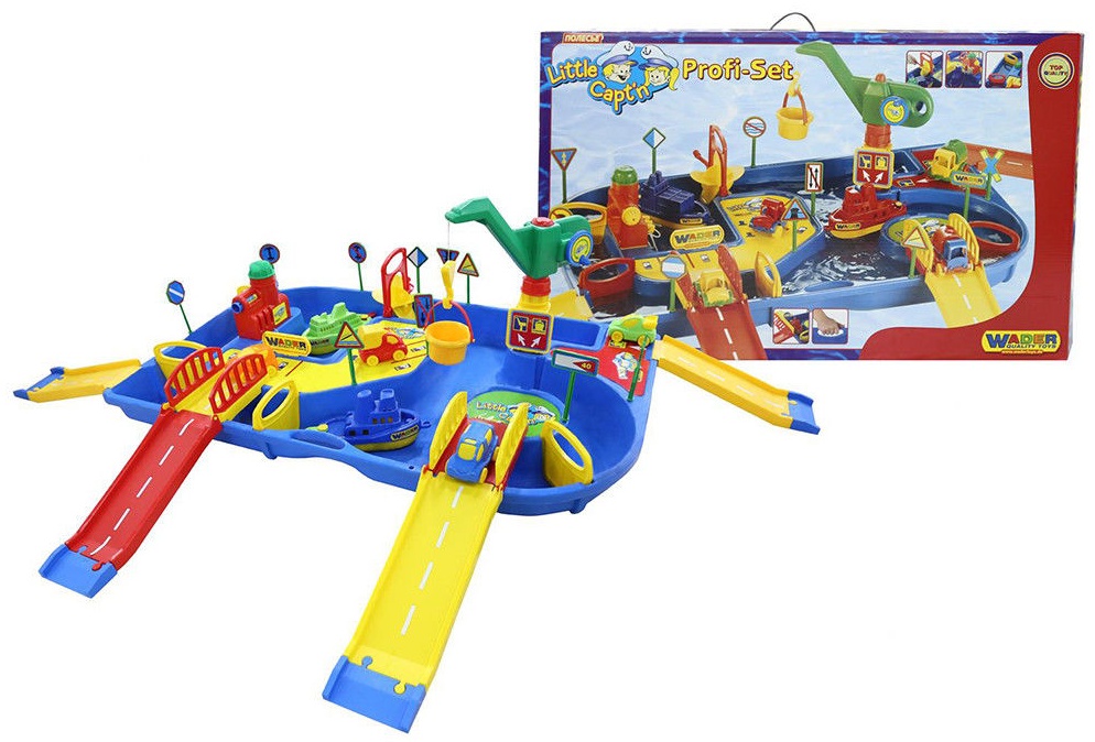WADER 51974 Profiset Wassersystem. WADER Little Cäptn Wasserwelt: Hier findet ihr unendliche Spielideen rund um Wasser und Transport: Autos, Schiffe, Schleusen, Fähren, Zugbrücken, Straßen und ein Kran können immer wieder neu eingesetzt werden. Fördern Sie die Kreativität Ihres Kindes! Setzen Sie auf bewährte WADER-Qualität. Freuen Sie sich auf begeisterte Kinderaugen. Details: Material: Kunststoff , Aufbaumaß ca. 94 x 13,5 x 57,5 cm, Gewicht: 4,54 kg, 44 Teile in Box, Produktionsbedingt kann es zu Farbwechseln einzelner Komponenten des Spielzeugs kommen - daher: Farbliche Änderungen vorbehalten!. Achtung! Nicht geeignet für Kinder unter 36 Monaten. Ihr Kind spielt aktiv, lernt, tummelt sich. Alle Spielzeuge unter dem Markennamen WADER QUALITY TOYS sind mit Liebe zum Detail entwickelt, alle Werkstoffe sind sicher und ungefährlich. Wir möchten, dass alle Kinder viel Freude an unseren Produkten haben. Danach streben wir und arbeiten daran jeden Tag hart. Und so werden wir auch weiter arbeiten. Versprochen! Die Spielzeug-Produkte von WADER überzeugen seit 1956 mit bester Qualität und ausgezeichnetem Design. Das Spielzeug der populären Marke wird nach aktuellstem Stand der Technik in der Kunststoffindustrie produziert. Sämtliche Gesundheitsvorschriften sind vorbildlich eingehalten und so erfüllt das Spielzeug selbstverständlich alle Richtlinien und Normen.