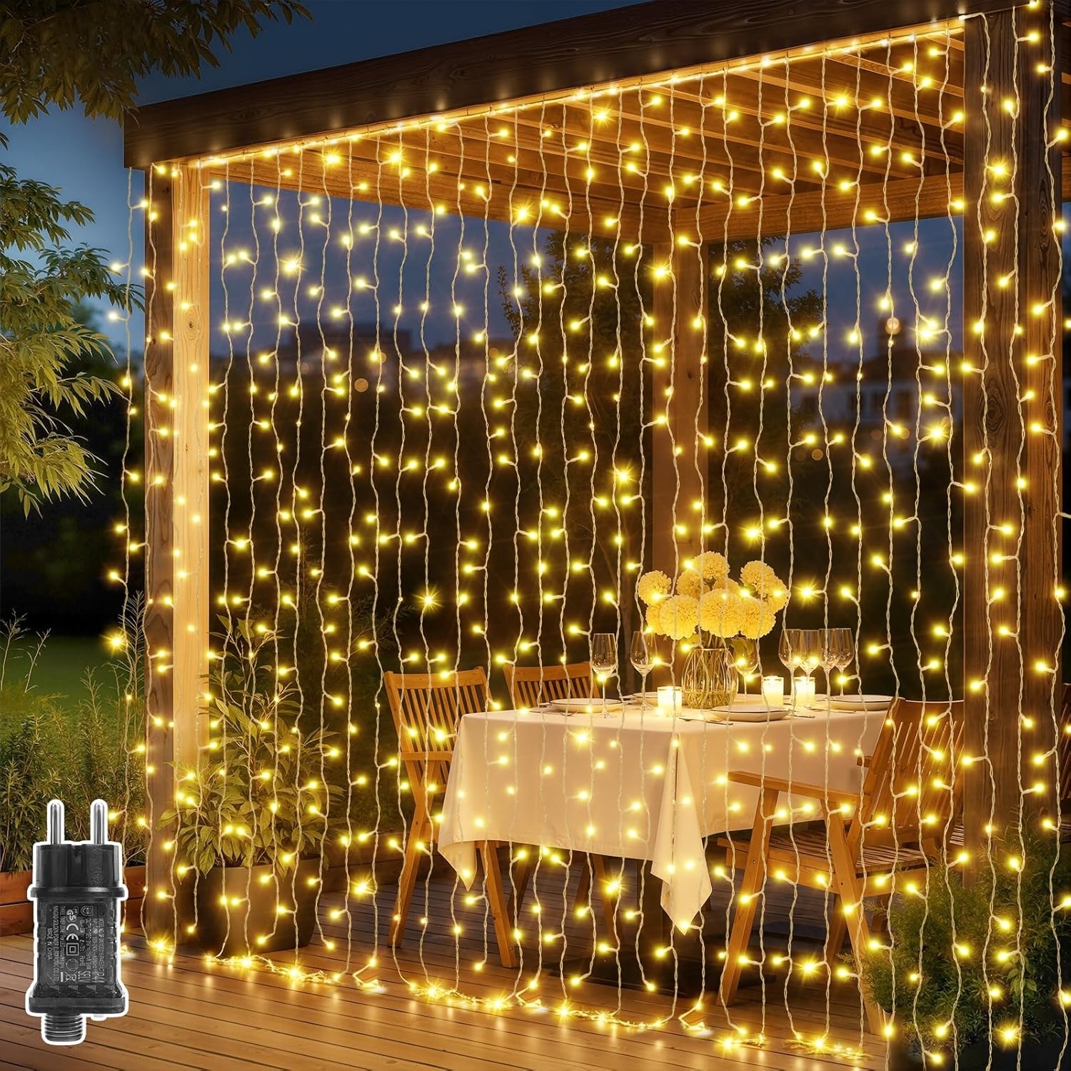 | Name | Lichtervorhang Innen LED Lichterkette Vorhang Außen 3x3 m 300 F5-LEDs PVC Fairy Lights mit Fernbedienung Timer,8Modi,IP65 Wasserdicht Weihnachtsdeko für Weihnachten Fenster/Party/Zimmer/Balkon-Warmweiß |