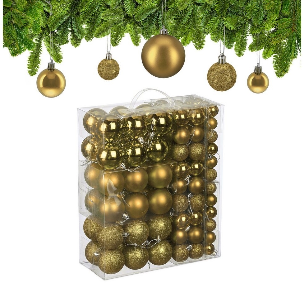 Mit dem Weihnachtskugeln 138er Set 10051290_259 verleihen Sie Ihrem Tannenbaum einen festlichen Glanz. Die Kugeln in matter, glänzender und glitzernder Oberfläche sind leicht mit Bändchen aufzuhängen. Dieses Set sorgt für eine besinnliche Atmosphäre und bringt sowohl Kinder als auch Erwachsene zum Staunen. **Highlights** - 138 Weihnachtsbaumkugeln für eine umfangreiche Dekoration - Kugeln in verschiedenen Oberflächen: matt, glänzend und glitzernd - Langlebiger Baumschmuck aus bruchsicherem Kunststoff - Glänzende Kugeln reflektieren das Licht für behaglichen Glanz - Inklusive praktischer Aufbewahrungsbox zum Verstauen **Produkteigenschaften** - Maße kleine Kugeln H x D: ca. 4x3 cm - Maße mittlere Kugeln H x D: ca. 5x4 cm - Maße große Kugeln H x D: ca. 7x6 cm - Gesamtgewicht: ca. 0,8 kg - Material: Kunststoff **Lieferumfang** - 138 x Weihnachtsbaumkugel - 1 x Aufbewahrungsbox - Dekoartikel sind nicht im Lieferumfang enthalten